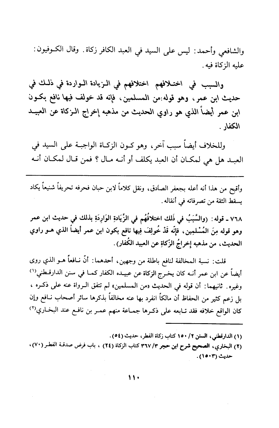 768 - قوله: (والسَّبَبُ في ذلك اختلافُهُم في الزيَادةِ الوَارِدةِ بذلك في حديث ابن عمر وهو قوله مِنَ المسْلمِين، فإِنه قَدْ خُولِفَ فِيها نافع يكون ابن عمر أيضًا الذي هو راوي الحديث، من مذهبه إِخراجُ الزكاةِ عن العبيد الكُفار).