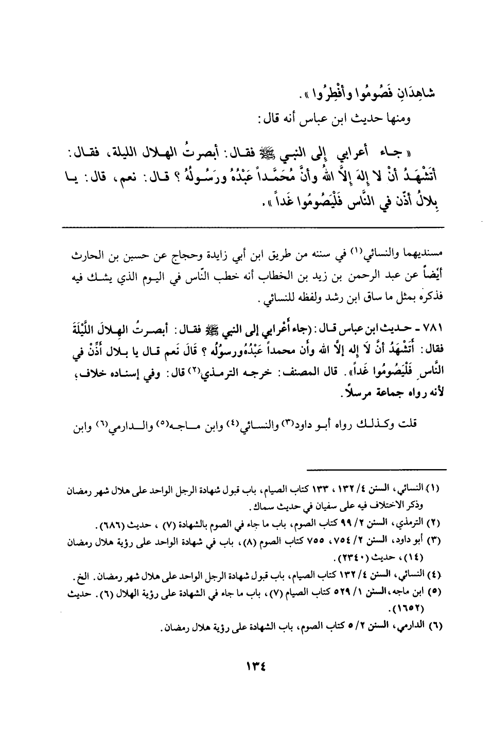 781 - حديث ابن عباس قال: (جاء أعْرابي إلى النبي - صلى الله عليه وسلم - فقال: أبصرتُ الهِلالَ الليلَةَ فقال: أتَشْهَدُ أنَّ لَا إله إلَّا الله وأن محمدًا عَبْدُهُ ورسوُلُه؟ قَالَ نَعم قال يا بلال أذِّنْ في النَّاسِ فَلْيَصُومُوا غدًا". قال المصنف: خرجه الترمذي قال: وفي إسناده خلاف؛ لأنه رواه جماعة مرسلًا.