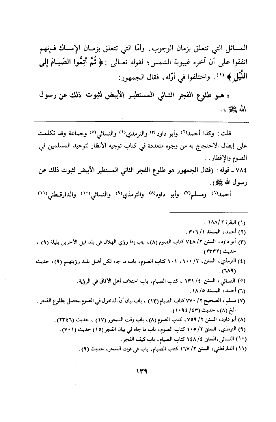 784 - قوله: (فقال الجمهور هو طلوع الفجر الثاني المستطير الأبيض لثبوت ذلك عن رسول الله - صلى الله عليه وسلم -).