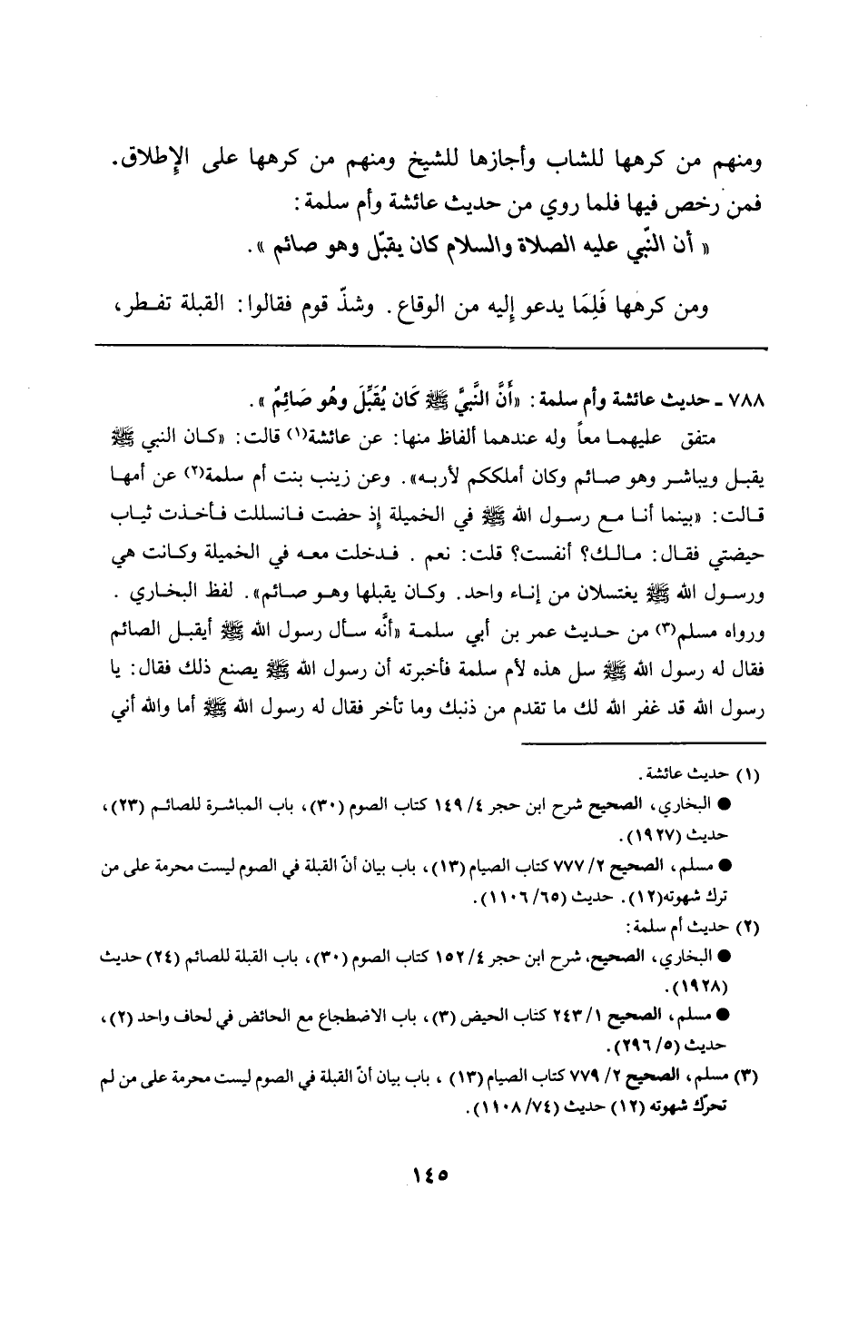 788 - حديث عائشة وأم سلمة: "أن النبي - صلى الله عليه وسلم - كَان يُقَبِّلَ وهُو صائمٌ".