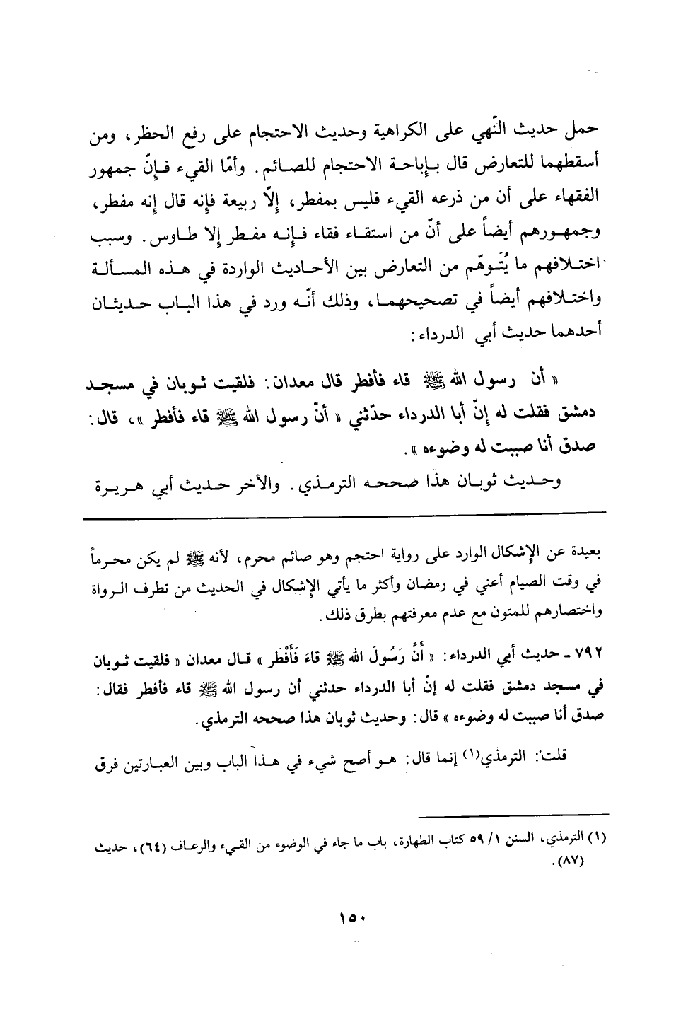 792 - حديث أبي الدرداء: "أن رَسُولَ الله - صلى الله عليه وسلم - قاءَ فَأفْطَر" قال معدان "فلقيت ثوبان في مسجد دمشق فقلت له إن أبا الدرداء حدثني أن رسول الله - صلى الله عليه وسلم - قاء فأفطر فقال: صدق أنا صببت له وضوءه" قال: وحديث ثوبان هذا صححه الترمذي.