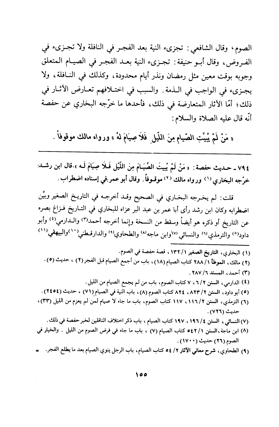 794 - حديث حفصة: "مَنْ لَمْ يُبيتَ الصِّيَامَ مِنَ اللّيْل فَلَا صيامَ لَه". قال ابن رشد: خرّجه البخاري ورواه مالك موقوفًا. وقال أبو عمر بقي إسناده اضطراب.