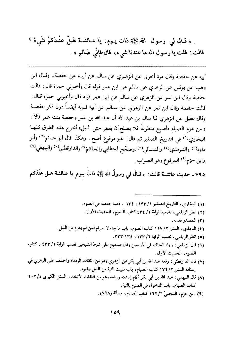 أبيه عن حفصة وقال مرة أخرى عن الزهريّ عن سالم عن أبيه عن حفصة، وقال ابن وهب عن يونس عن الزهريّ عن سالم عن ابن عمر قوله قال وأخبرني حمزة قال: قالت حفصة وقال ابن نمر عن الزهريّ بن سالم عن ابن عمر قوله قال وأخبرني حمزة قال: قالت حفصة وقال ابن نمر عن الزهريّ عن سالم عن أبيه قوله أيضًا دون ذكر حفصة وقال عقيل عن الزهريّ ثنا سالم بن عبد الله أن عبد الله بن عمر وحفصة بنت عمر قالا: "من عزم الصيام فأصبح متطوعًا فلا يصلح أن يفطر حتى الليل" أخرج هذه الطرق كلها البخاري في التاريخ الصغير ثم قال: غير مرفوع أصح. وهكذا قال أبو حاتم وأبو داود والترمذي والنسائي. وصحح الخطابي والحاكم والدارقطني والبيهقي وابن حزم المرفوع وهو الصواب.