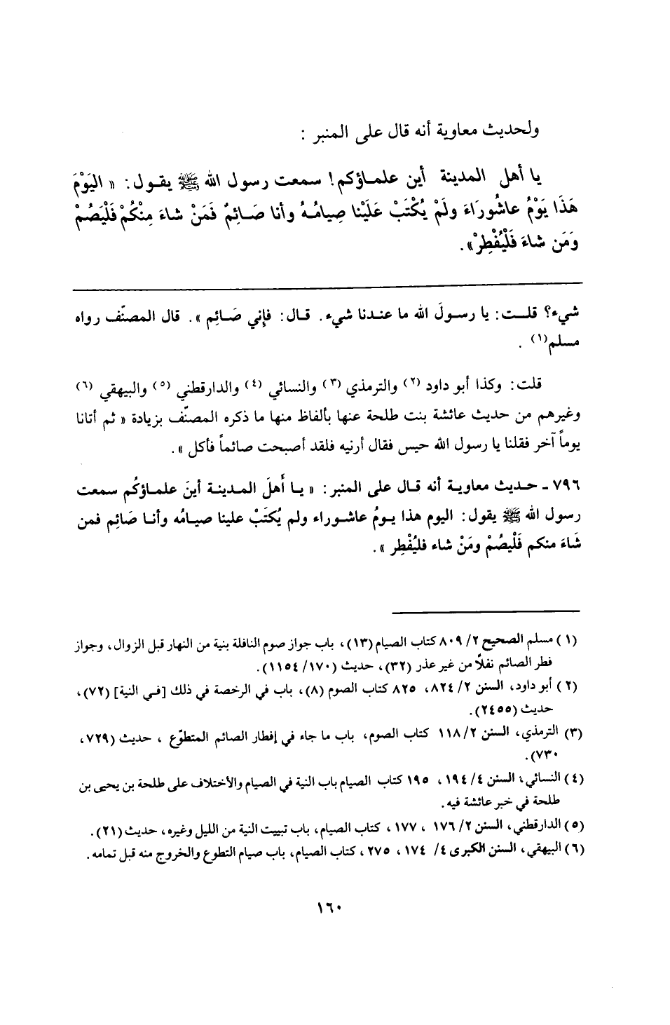 796 - حديث معاوية أنه قال على المنبر: "يا أهلَ المدينة أينَ علماؤكُم سمعت رسول الله - صلى الله عليه وسلم - يقول: اليوم هذا يومُ عاشوراء ولم يُكتَبْ علينا صيامُه وأنا صَائم فمن شَاءَ منكم فَلْيصمْ ومَنْ شاء فليُفْطِر".