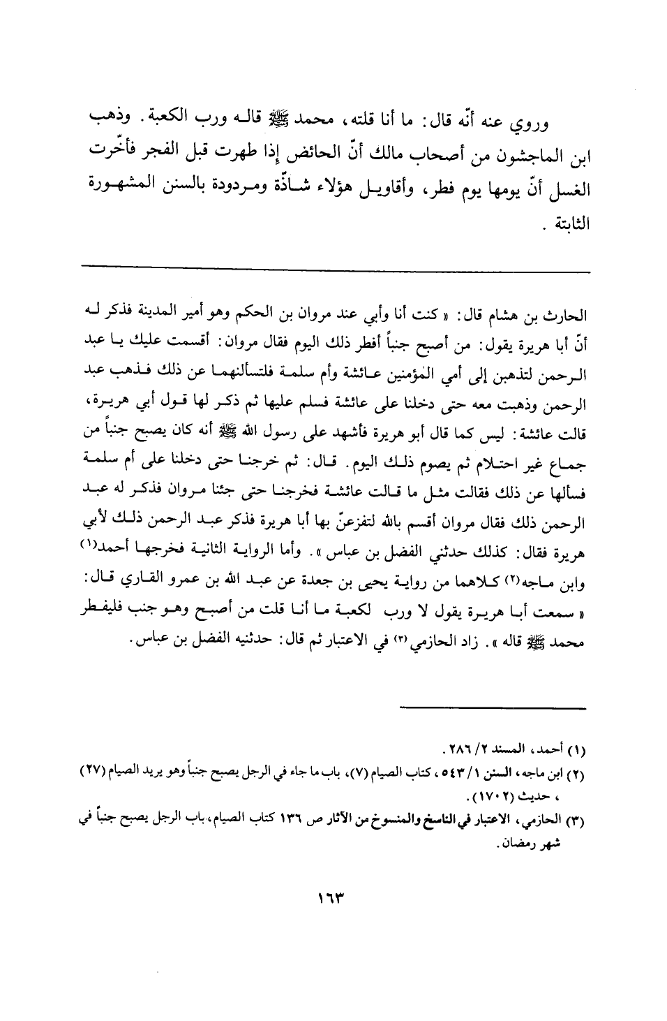 الحارث بن هشام قال: "كنت أنا وأبي عند مروان بن الحكم وهو أمير المدينة فذكر له أنّ أبا هريرة يقول: من أصبح جنبًا أفطر ذلك اليوم فقال مروان: أقسمت عليك يا عبد الرحمن لتذهبن إلى أمي المؤمنين عائشة وأم سلمة فلتسألنهما عن ذلك فذهب عبد الرحمن وذهبت معه حتى دخلنا على عائشة فسلم عليها ثم ذكر لها قول أبي هريرة، قالت عائشة: ليس كما قال أبو هريرة فأشهد على رسول الله - صلى الله عليه وسلم - أنه كان يصبح جنبًا من جماع غير احتلام ثم يصوم ذلك اليوم. قال: ثم خرجنا حتى دخلنا على أم سلمة فسألها عن ذلك فقالت مثل ما قالت عائشة فخرجنا حتى جئنا مروان فذكر له عبد الرحمن ذلك فقال مروان أقسم بالله لتفزعنّ بها أبا هريرة فذكر عبد الرحمن ذلك لأبي هريرة فقال: كذلك حدثني الفضل بن عباس". وأما الرواية الثانية فخرجها أحمد وابن ماجه كلاهما من رواية يحيى بن جعدة عن عبد الله بن عمرو القاري قال: "سمعت أبا هريرة يقول لا ورب الكعبة ما أنا قلت من أصبح وهو جنب فليفطر محمَّد - صلى الله عليه وسلم - قاله". زاد الحازمي في الاعتبار ثم قال: حدثنيه الفضل بن عباس.
