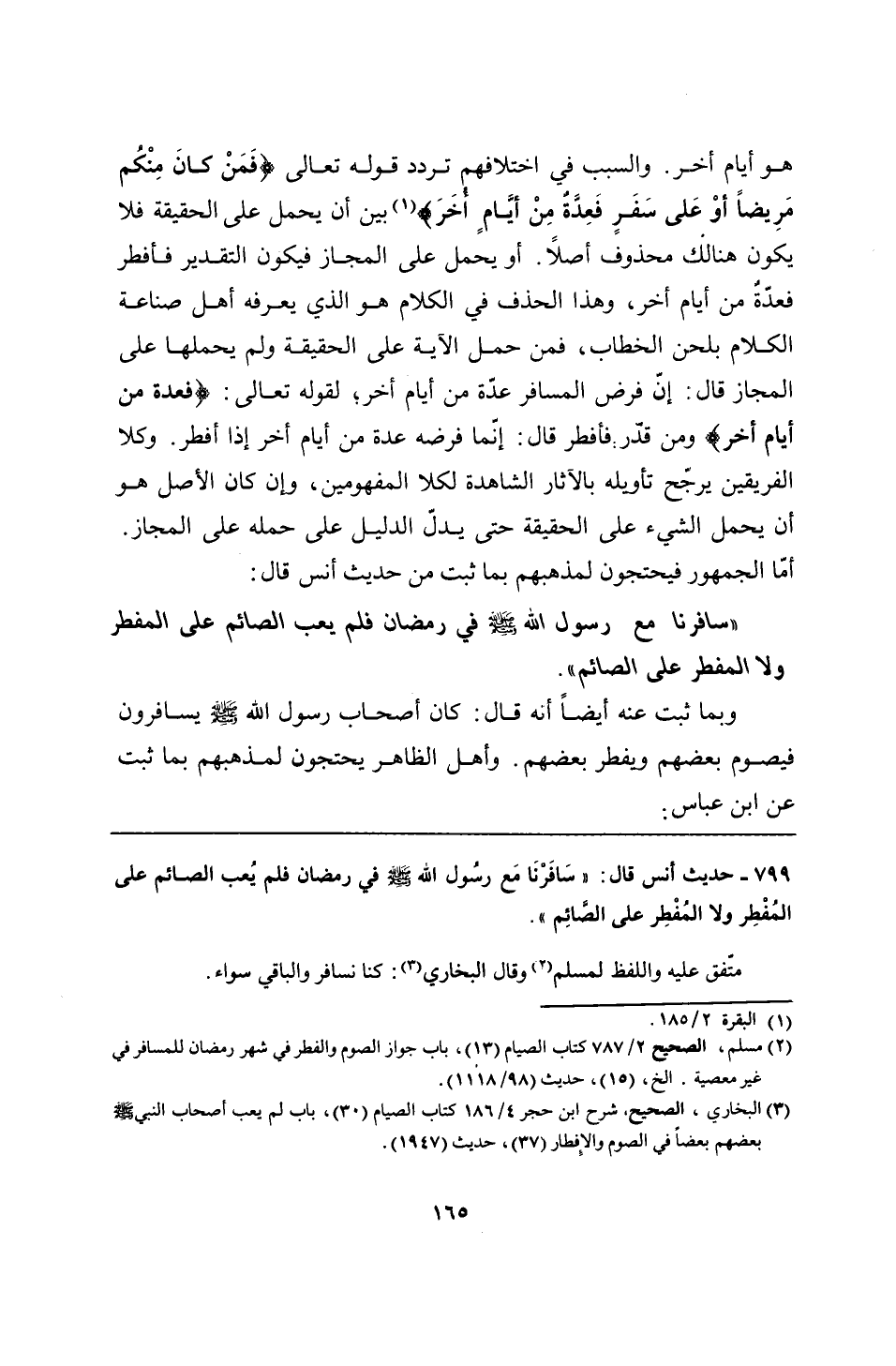 799 - حديث أنس قال: "سَافَرْنَا مَع رسُول الله - صلى الله عليه وسلم - في رمضان فلم يُعب الصائم على المُفْطِر ولا المُفْطِر على الصَّائِم".