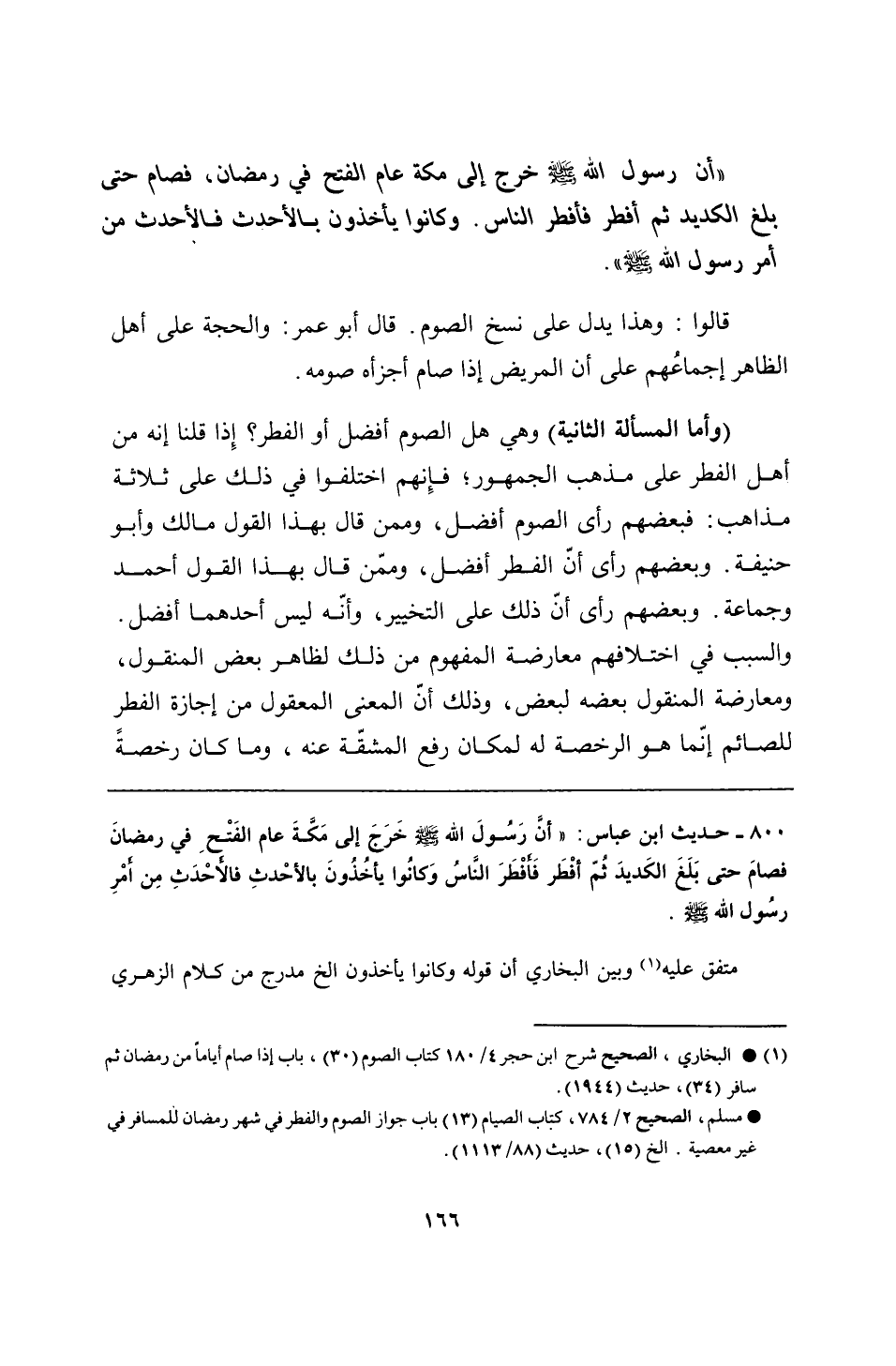 800 - حديث ابن عباس: "أنَّ رَسُولَ الله - صلى الله عليه وسلم - خَرَجَ إلى مَكَةَ عام الفَتْحِ في رمضانَ فصامَ حتى بَلَغَ الكَديدَ ثُمَّ أفْطَر فَأفْطَرَ النَّاسُ وَكانُوا يأخُذُونَ بالأحْدثِ فالأحْدَثِ مِن أمْرِ رسول الله - صلى الله عليه وسلم -.