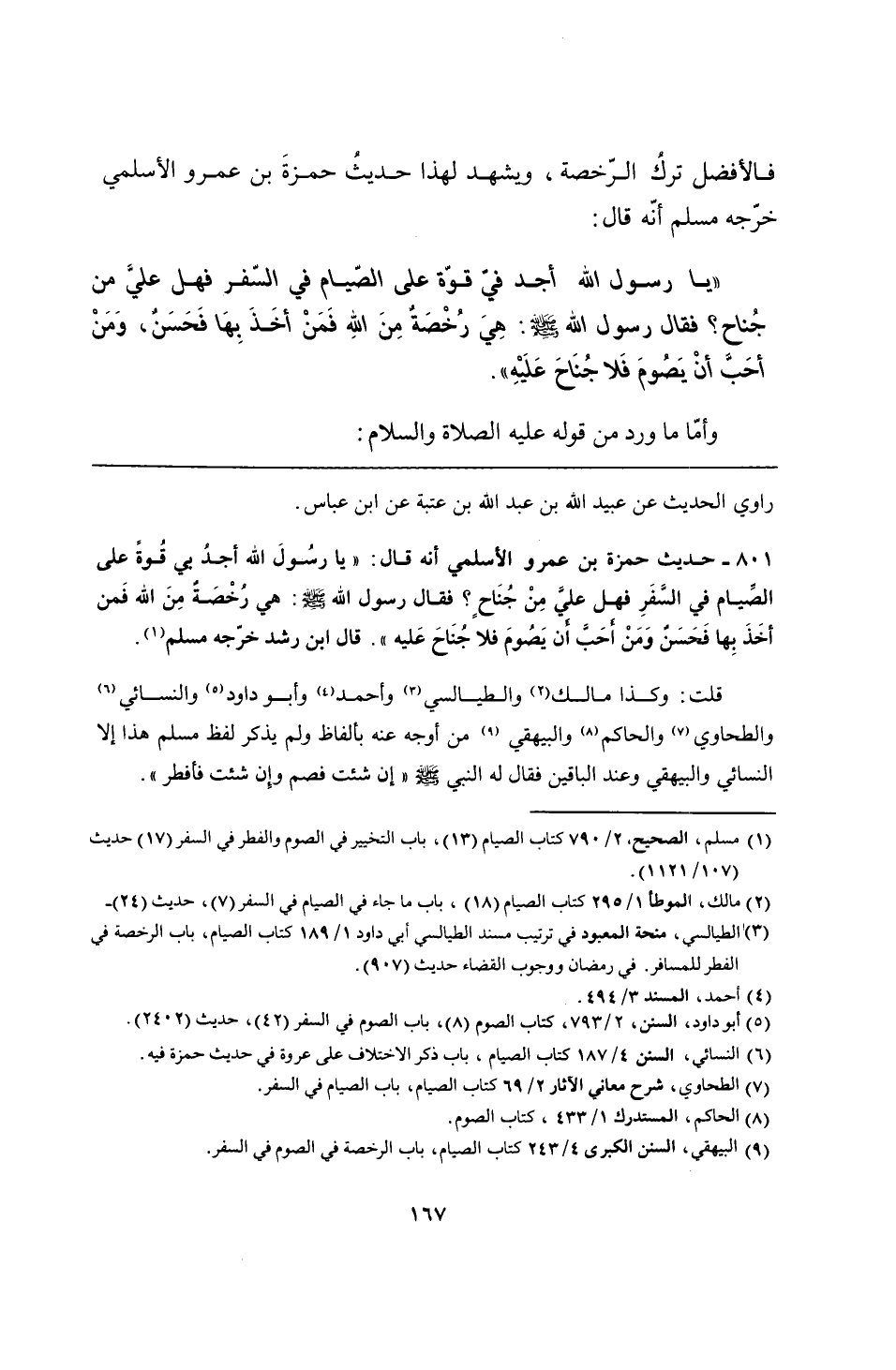 801 - حديث حمزة بن عمرو الأسلمي أنه قال: "يا رسُولَ الله أجدُ بي قُوة على الصيام في السفَرِ فهل علي مِنْ جُنَاحٍ؟ فقال رسول الله - صلى الله عليه وسلم -: هي رُخْصَة مِنَ الله فَمن أخَذَ بِها فَحَسَن وَمَنْ أحَبَّ أن يَصُومَ فلا جُنَاحَ عَليه". قال ابن رشد خرّجه مسلم.