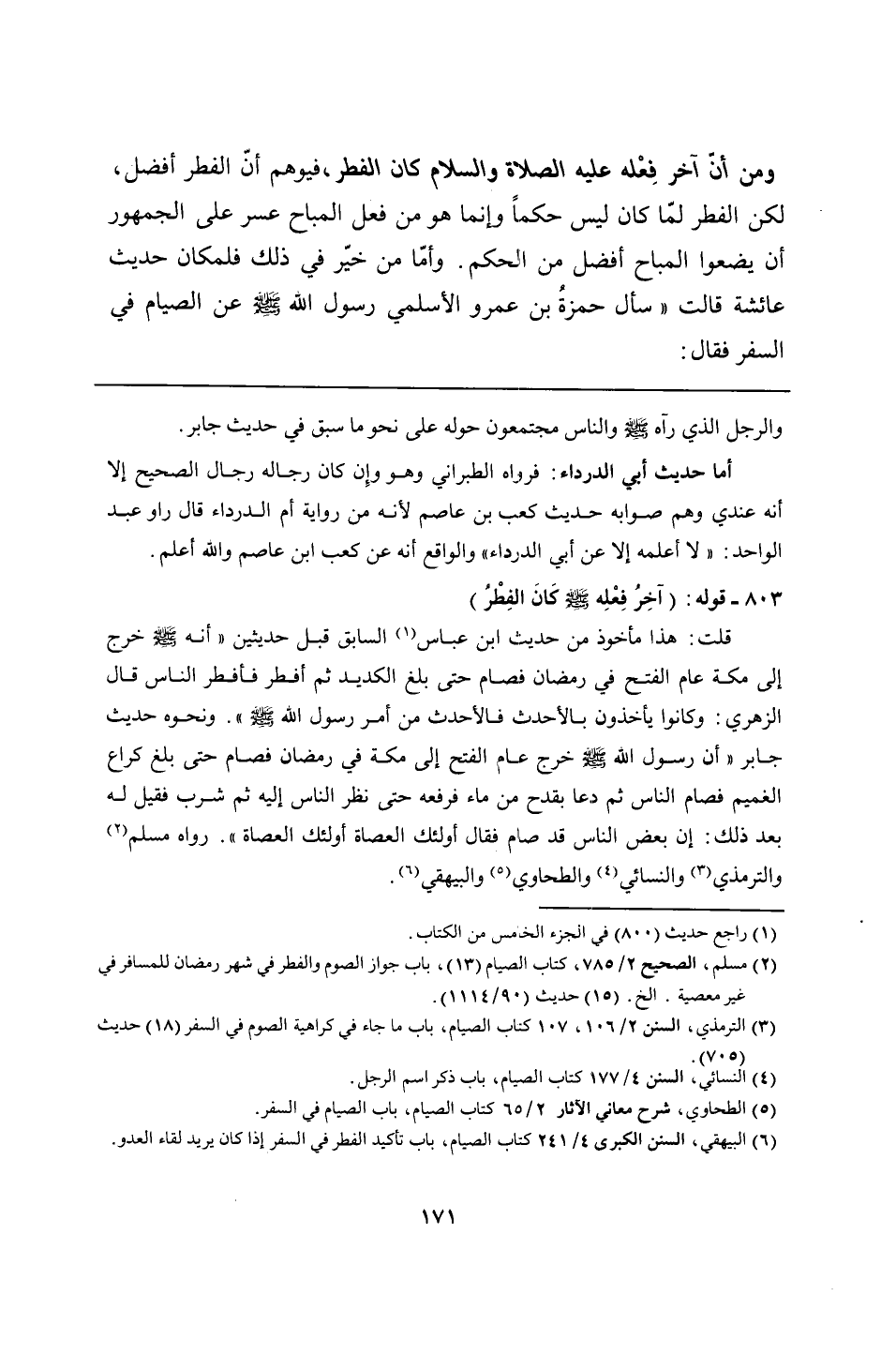 قلت: هذا مأخوذ من حديث ابن عباس السابق قبل حديثين "أنه - صلى الله عليه وسلم - خرج إلى مكة عام الفتح في رمضان فصام حتى بلغ الكديد ثم أفطر فأفطر الناس قال الزهريّ: وكانوا يأخذون بالأحدث فالأحدث من أمر رسول الله - صلى الله عليه وسلم -". ونحوه حديث جابر "أن رسول الله - صلى الله عليه وسلم - خرج عام الفتح إلى مكة في رمضان فصام حتى بلغ كراع الغميم فصام الناس ثم دعا بقدح من ماء فرفعه حتى نظر الناس إليه ثم شرب فقيل له بعد ذلك: إن بعض الناس قد صام فقال أولئك العصاة أولئك العصاة". رواه مسلم والترمذي والنسائي والطحاوي والبيهقي.