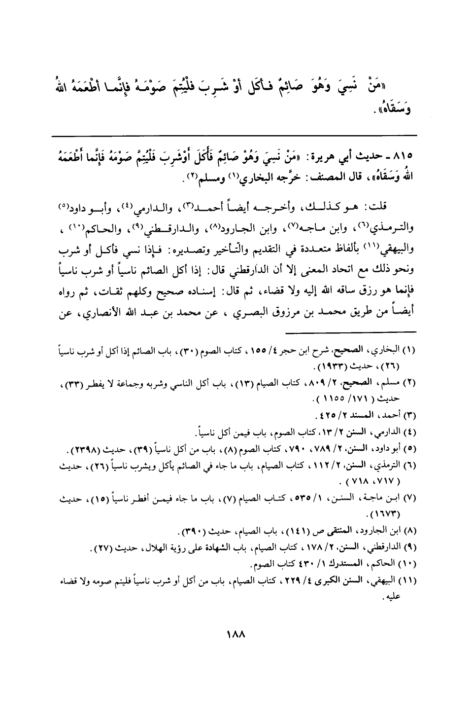 815 - حديث أبي هريرة: "مَنْ نَسِيَ وَهُو صائم فَأكلَ أوْ شَرِبَ فَلْيُتم صَوْمَهُ فَإِنَّما أطْعَمَهُ اللهُ وَسَقَاهُ"، قال المصنف: خرجه البخاري ومسلم.