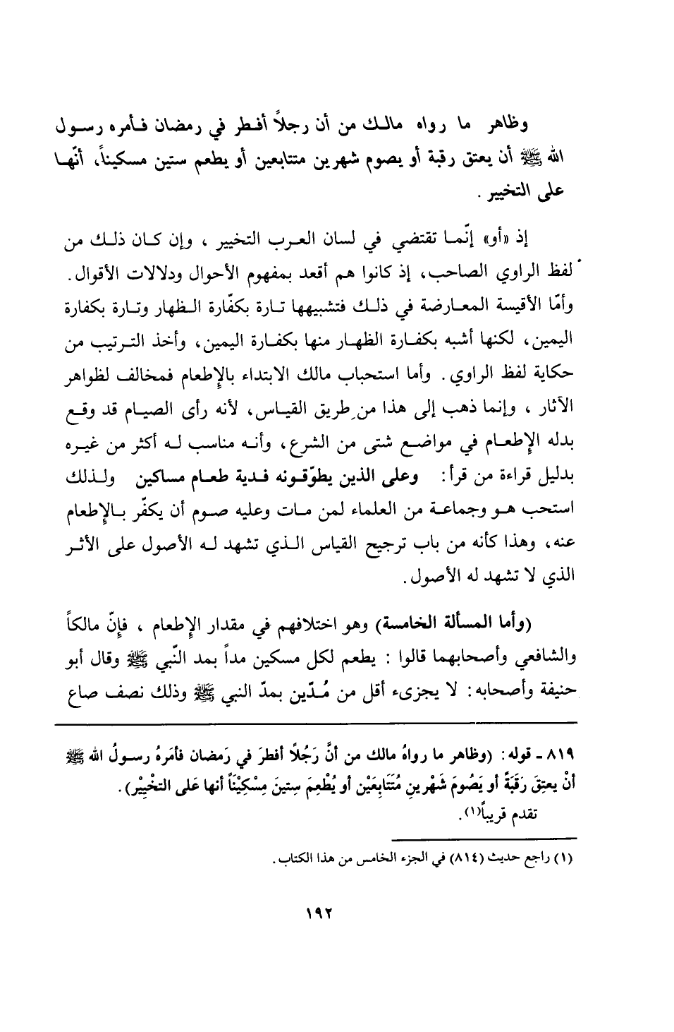 819 - قوله: (وظاهر ما رواهُ مالك من أن رَجُلًا أفطرَ في رَمضان فأمَرهُ رسولُ الله - صلى الله عليه وسلم - أن يعتِقَ رقَبَةً أو يَصُومَ شَهْرينِ مُتتابِعَيْن أو يُطْعِمَ سِتينَ مِسْكِيْنًا أنها عَلى التخْيِيْر).