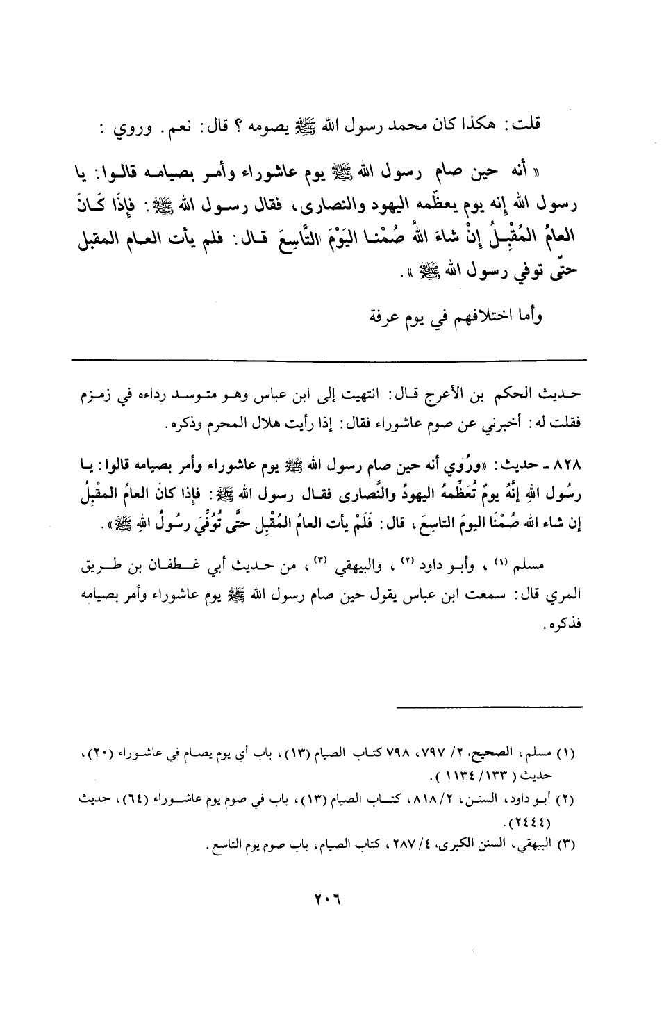 828 - حديث: "ورُوي أنه حين صام رسول الله - صلى الله عليه وسلم - يوم عاشوراء وأمر بصيامه قالوا: يا رسُول اللهِ إنهُ يومٌ تُعَظِّمهُ اليهودُ والنَّصارى فقال رسول الله - صلى الله عليه وسلم -: فإِذا كانَ العامُ المقْبِلُ إن شاء الله صُمْنَا اليومَ التاسِعَ، قال: فَلَمْ يأت العام المقْبِل حتى تُوُفيَ رسُولُ اللهِ - صلى الله عليه وسلم -".