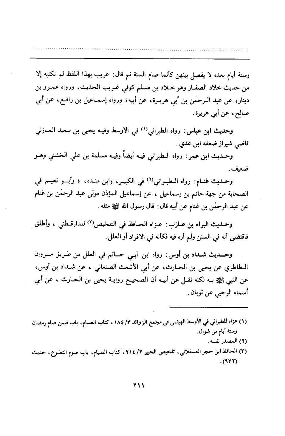 وحديث غنام: رواه الطبراني في الكبير، وابن منده؛ وأبو نعيم في الصحابة من جهة حاتم بن إسماعيل، عن إسماعيل المؤذن مولى عبد الرحمن بن غنام عن عبد الرحمن بن غنام عن أبيه قال: قال رسول الله - صلى الله عليه وسلم - مثله.