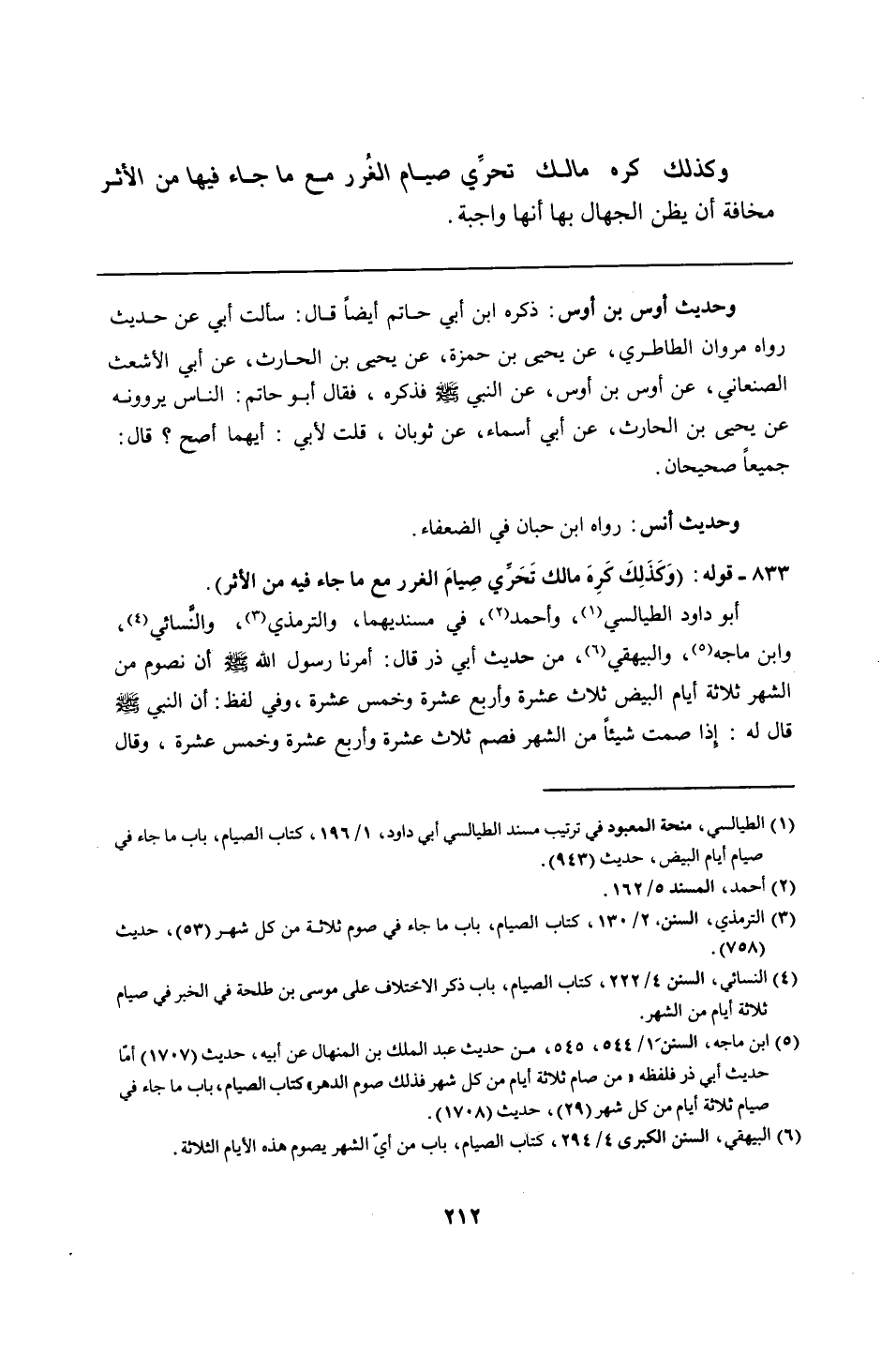 أبو داود الطيالسي، وأحمد، في مسنديهما، والترمذي، والنَّسائي، وابن ماجه، والبيهقي، من حديث أبي ذر قال: أمرنا رسول الله - صلى الله عليه وسلم - أن نصوم من الشهر ثلاثة أيام البيض ثلاث عشرة وأربع عشرة وخمس عشرة، وفي لفظ: أن النبي - صلى الله عليه وسلم - قال له: إذا صمت شيئًا من الشهر فصم ثلاث عشرة وأربع عشرة وخمس عشرة، وقال