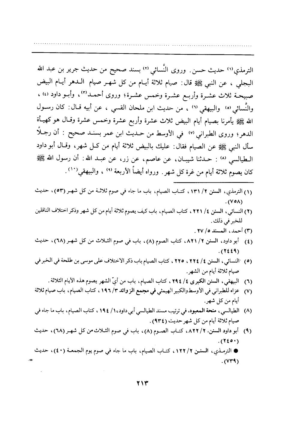 الترمذي حديث حسن. وروى النَّسائي بسند صحيح من حديث جرير بن عبد الله البجلي، عن النبي - صلى الله عليه وسلم - قال: صيام ثلاثة أيام من كل شهر صيام الدهر أيام البيض صبيحة ثلاث عشرة وأربع عشرة وخمس عشرة، وروى أحمد، وأبو داود، والنَّسائي والبيهقي، من حديث ابن ملحان القسي، عن أبيه قال: كان رسول الله - صلى الله عليه وسلم - يأمرنا بصيام أيام البيض ثلاث عشرة وأربع عشرة وخمس عشرة وقال هو كهيأة الدهر؛ وروى الطبراني في الأوسط من حديث ابن عمر بسند صحيح: أن رجلًا سأل النبي - صلى الله عليه وسلم - عن الصيام فقال: عليك بالبيض ثلاثة أيام من كل شهر، وقال أبو داود الطيالسي: حدثنا شيبان، عن عاصم، عن زر، عن عبد الله: أن رسول الله - صلى الله عليه وسلم - كان يصوم ثلاثة أيام من غرة كل شهر. ورواه أيضًا الأربعة، والبيهقي.