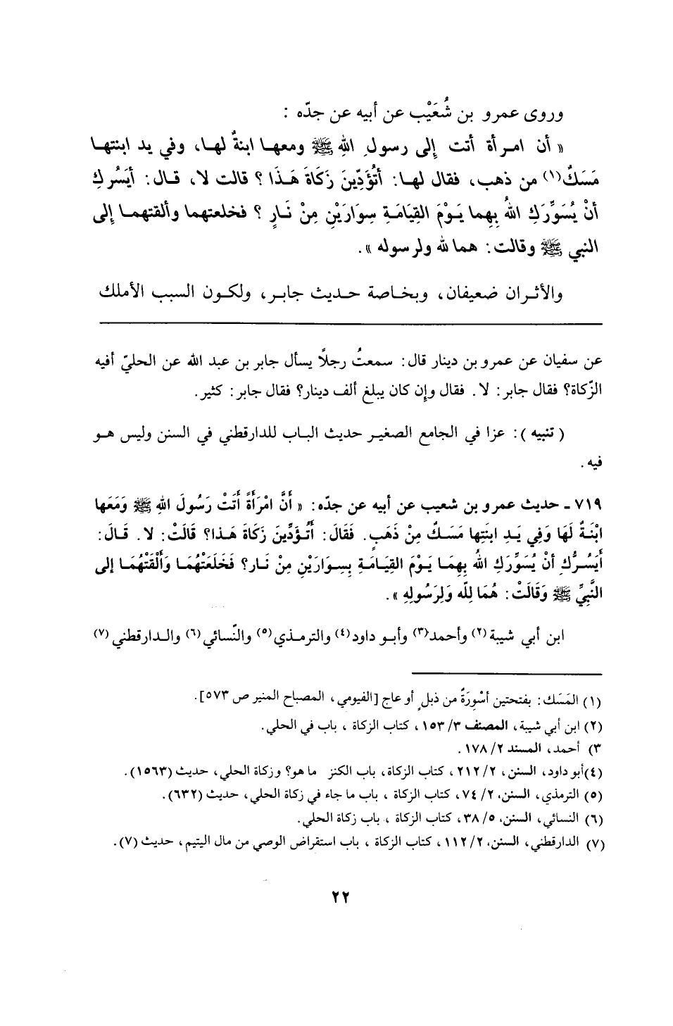 719 - حديث عمرو بن شعيب عن أبيه عن جدّه: "أَنَّ امْرَأةً أَتَتْ رَسُولَ اللهِ - صلى الله عليه وسلم - وَمَعَها ابْنَةٌ لَهَا وَفِي يَدِ ابنَتِها مَسَكٌ مِنْ ذَهَبٍ. فَقَالَ: أَتؤَدِّينَ زَكَاةَ هَذا؟ قَالَتْ: لا. قَالَ: أَيَسُرُّكِ أنْ يُسَوِّرَكِ الله بِهِمَا يَوْمَ القِيَامَةِ بِسِوَارَيْنِ مِنْ نَار؟ فَخَلَعَتْهُمَا وَأَلْقَتْهُمَا إلى النَّبِيِّ - صلى الله عليه وسلم - وَقَالَتْ: هُمَا لِلّه وَلِرَسُولِهِ".
