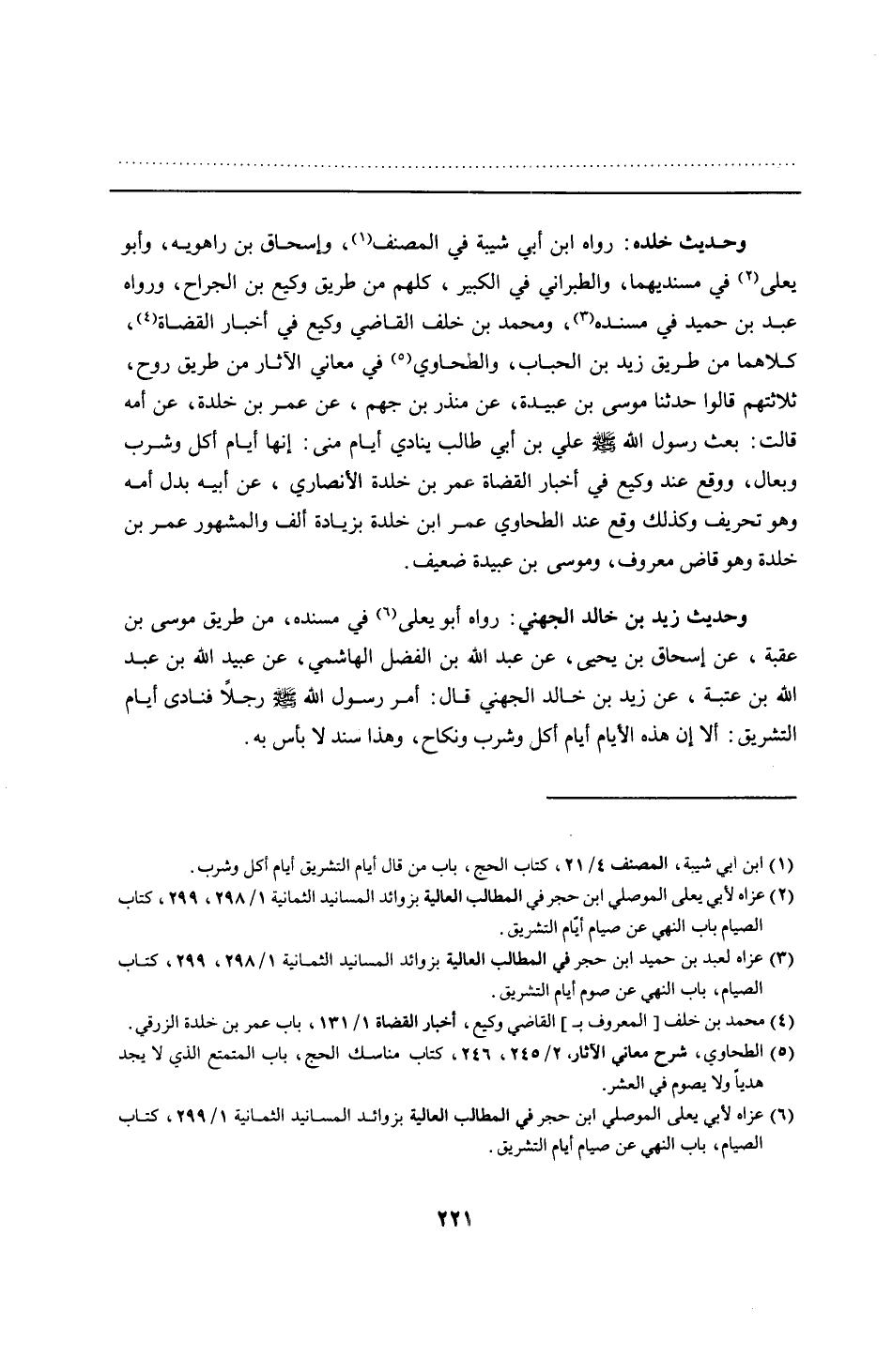 وحديث زيد بن خالد الجهني: رواه أبو يعلى في مسنده, من طريق موسى بن عقبة، عن إسحاق بن يحيى، عن عبد الله بن الفضل الهاشمي، عن عبيد الله بن عبد الله بن عتبة، عن زيد بن خالد الجهني قال: أمر رسول الله - صلى الله عليه وسلم - رجلًا فنادى أيام التشريق: ألا إن هذه الأيام أيام أكل وشرب ونكاح، وهذا سند لا بأس به.