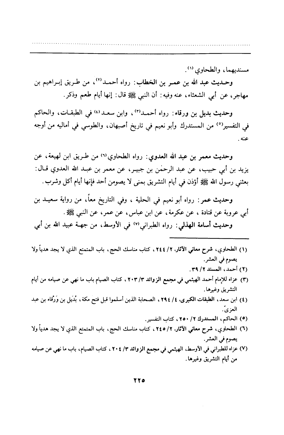 وحديث معمر بن عبد الله العدوي: رواه الطحاوي من طريق ابن لهيعة، عن يزيد بن أبي حبيب، عن عبد الرحمن بن جبير، عن معمر بن عبد الله العدوي قال: بعثني رسول الله - صلى الله عليه وسلم - أؤذن في أيام التشريق، بمنى لا يصومن أحد فإِنها أيام أكل وشرب.