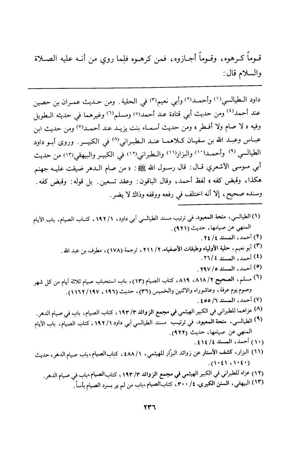 داود الطيالسي وأحمد وأبي نعيم في الحلية. ومن حديث عمران بن حصين عند أحمد ومن حديث أبي قتادة عند أحمد ومسلم وغيرهما في حديثه الطويل وفيه "لا صام ولا أفطر" ومن حديث أسماء بنت يزيد عند أحمد ومن حديث ابن عباس وعبد الله بن سفيان كلاهما عند الطبراني في الكبير. وروى أبو داود الطيالسي وأحمد والبزار والطبراني في الكبير والبيهقي من حديث أبي موسى الأشعري قال: قال رسول الله - صلى الله عليه وسلم -: "من صام الدهر ضيقت عليه جهنم هكذا، وقبض كفه" لفظ أحمد، وقال الباقون: وعقد تسعين. بل قوله: وقبض كفه. وسنده صحيح، إلا أنه اختلف في رفعه ووقفه وذاك لا يضر.