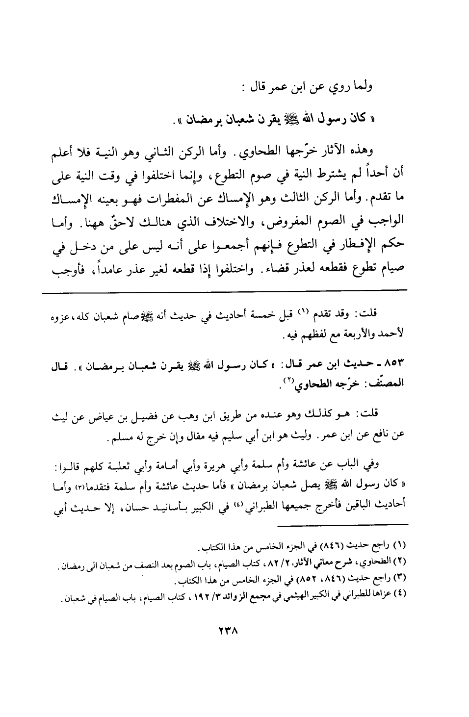 853 - حديث ابن عمر قال: "كان رسول الله - صلى الله عليه وسلم - يقرن شعبان برمضان". قال المصنف: خرّجه الطحاوي.