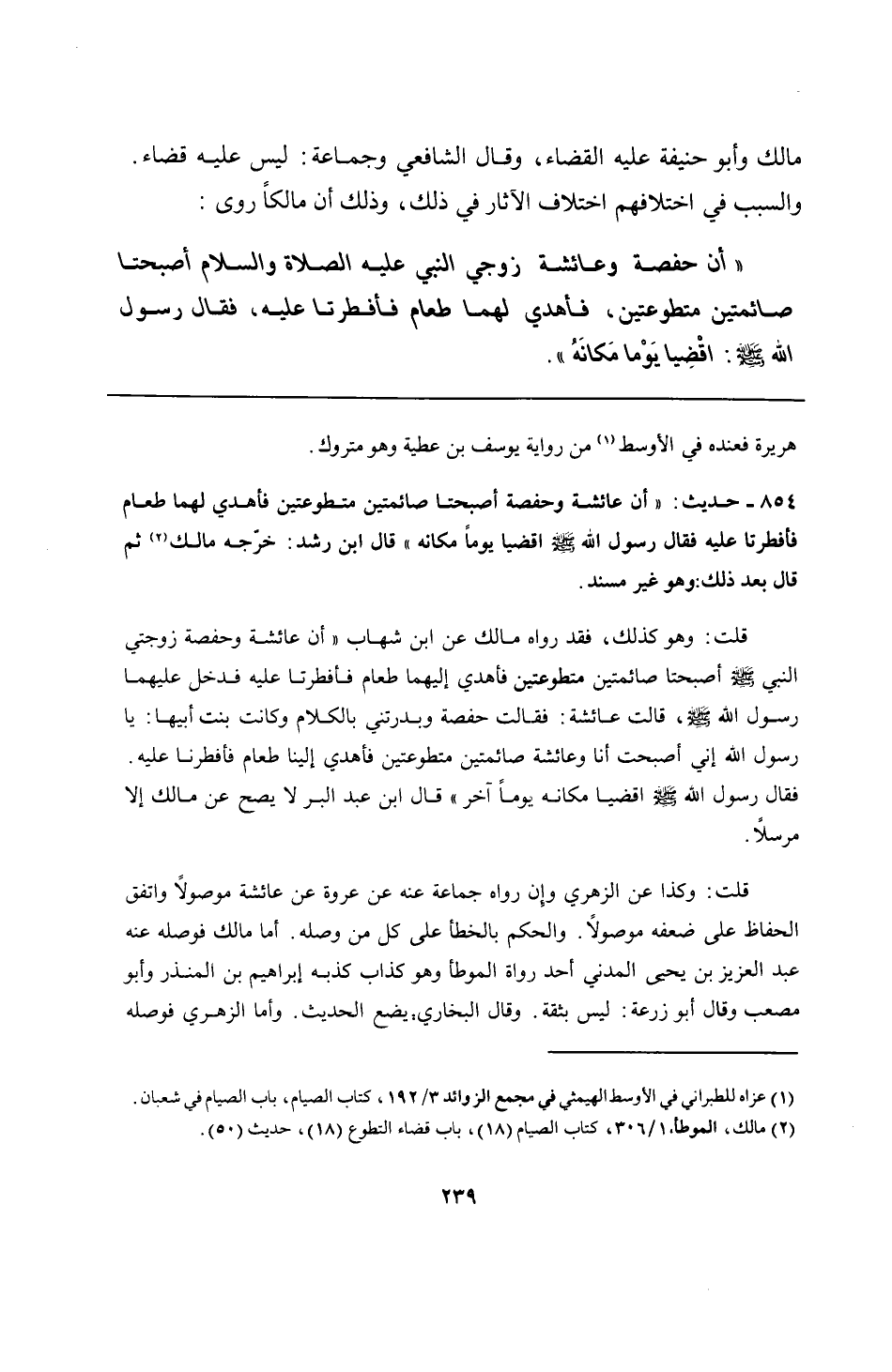 854 - حديث: "أن عائشة وحفصة أصبحتا صائمتين متطوعتين فأهدي لهما طعام فأفطرتا عليه فقال رسول الله - صلى الله عليه وسلم - اقضيا يومًا مكانه" قال ابن رشد: خرّجه مالك ثم قال بعد ذلك: وهو غير مسند.