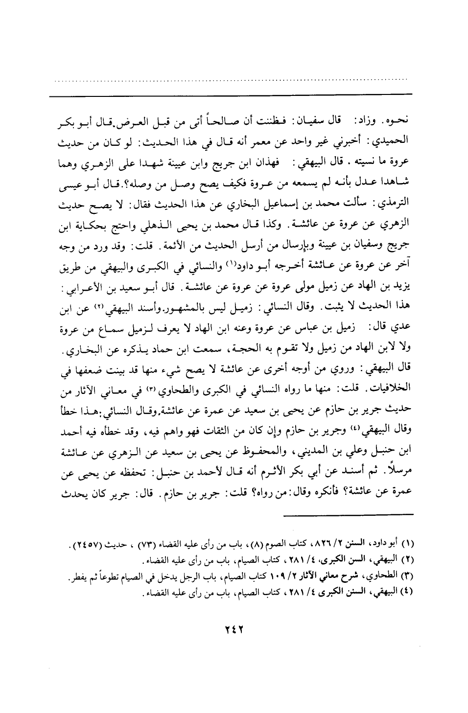نحوه. وزاد: قال سفيان: فظننت أن صالحًا أتى من قبل العرض قال أبو بكر الحميدي: أخبرني غير واحد عن معمر أنه قال في هذا الحديث: لو كان من حديث عروة ما نسيته. قال البيهقي: فهذان ابن جريج وابن عيينة شهدا على الزهريّ وهما شاهدا عدل بأنه لم يسمعه من عروة فكيف يصح وصل من وصله؟ قال أبو عيسى الترمذي: سألت محمَّد بن إسماعيل البخاري عن هذا الحديث فقال: لا يصح حديث الزهريّ عن عروة عن عائشة. وكذا قال محمَّد بن يحيى الذهلي واحتج بحكاية ابن جريج وسفيان بن عيينة وبإِرسال من أرسل الحديث من الأئمة. قلت: وقد ورد من وجه آخر عن عروة عن عائشة أخرجه أبو داود والنسائي في الكبرى والبيهقي من طريق يزيد بن الهاد عن زميل مولى عروة عن عروة عن عائشة. قال أبو سعيد بن الأعرابي: هذا الحديث لا يثبت. وقال النسائي: زميل ليس بالمشهور. وأسند البيهقي عن ابن عدي قال: زميل بن عباس عن عروة وعنه ابن الهاد لا يعرف لزميل سماع من عروة ولا لابن الهاد من زميل ولا تقوم به الحجة، سمعت ابن حماد يذكره عن البخاري. قال البيهقي: وروي من أوجه أخرى عن عائشة لا يصح شيء منها قد بينت ضعفها في الخلافيات. قلت: منها ما رواه النسائي في الكبرى والطحاوي في معاني الآثار من حديث جرير بن حازم عن يحيى بن سعيد عن عمرة عن عائشة وقال النسائي: هذا خطأ وقال البيهقي وجرير بن حازم وإِن كان من الثقات فهو واهم فيه، وقد خطأه فيه أحمد ابن حنبل وعلي بن المديني، والمحفوظ عن يحيى بن سعيد عن الزهري عن عائشة مرسلًا. ثم أسند عن أبي بكر الأثرم أنه قال لأحمد بن حنبل: تحفظه عن يحيى عن عمرة عن عائشة؟ فأنكره وقال: من رواه؟ قلت: جرير بن حازم. قال: جرير كان يحدث