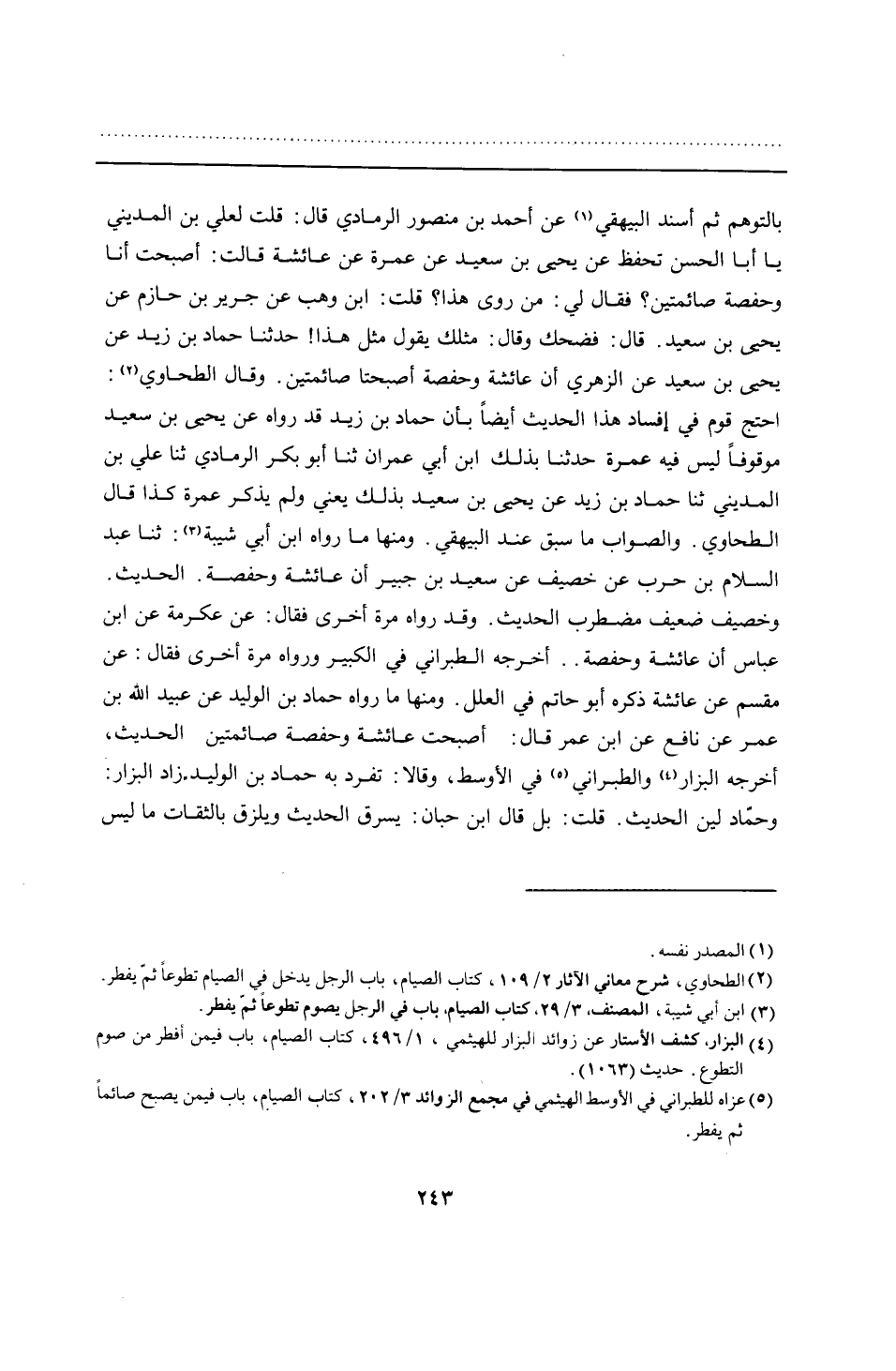 بالتوهم ثم أسند البيهقي عن أحمد بن منصور الرمادي قال: قلت لعلي بن المديني يا أبا الحسن تحفظ عن يحيى بن سعيد عن عمرة عن عائشة قالت: أصبحت أنا وحفصة صائمتين؟ فقال لي: من روى هذا؟ قلت: ابن وهب عن جرير بن حازم عن يحيى بن سعيد. قال: فضحك وقال: مثلك يقول مثل هذا! حدثنا حماد بن زيد عن يحيى بن سعيد عن الزهريّ أن عائشة وحفصة أصبحتا صائمتين. وقال الطحاوي: احتج قوم في إفساد هذا الحديث أيضًا بأن حماد بن زيد قد رواه عن يحيى بن سعيد موقوفًا ليس فيه عمرة حدثنا بذلك ابن أبي عمران ثنا أبو بكر الرمادي ثنا علي بن المديني ثنا حماد بن زيد عن يحيى بن سعيد بذلك يعني ولم يذكر عمرة كذا قال الطحاوي. والصواب ما سبق عند البيهقي. ومنها ما رواه ابن أبي شيبة: ثنا عبد السلام بن حرب عن خصيف عن سعيد بن جبير أن عائشة وحفصة. الحديث. وخصيف ضعيف مضطرب الحديث. وقد رواه مرة أخرى فقال: عن عكرمة عن ابن عباس أن عائشة وحفصة .. أخرجه الطبراني في الكبير ورواه مرة أخرى فقال: عن مقسم عن عائشة ذكره أبو حاتم في العلل. ومنها ما رواه حماد بن الوليد عن عبيد الله بن عمر عن نافع عن ابن عمر قال: أصبحت عائشة وحفصة صائمتين الحديث، أخرجه البزار والطبراني في الأوسط, وقالا: تفرد به حماد بن الوليد. زاد البزار: وحمّاد لين الحديث. قلت: بل قال ابن حبان: يسرق الحديث ويلزق بالثقات ما ليس
