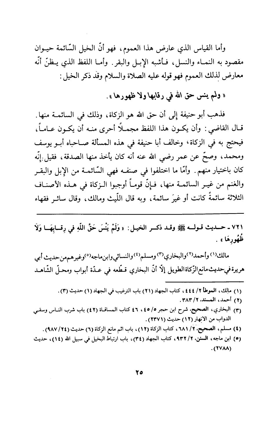 721 - حديث قوله - صلى الله عليه وسلم - وقد ذكر الخيل: "وَلَمْ يَنْسَ حَقَّ اللهِ في رِقابِهَا وَلَا ظُهُورِهَا".
