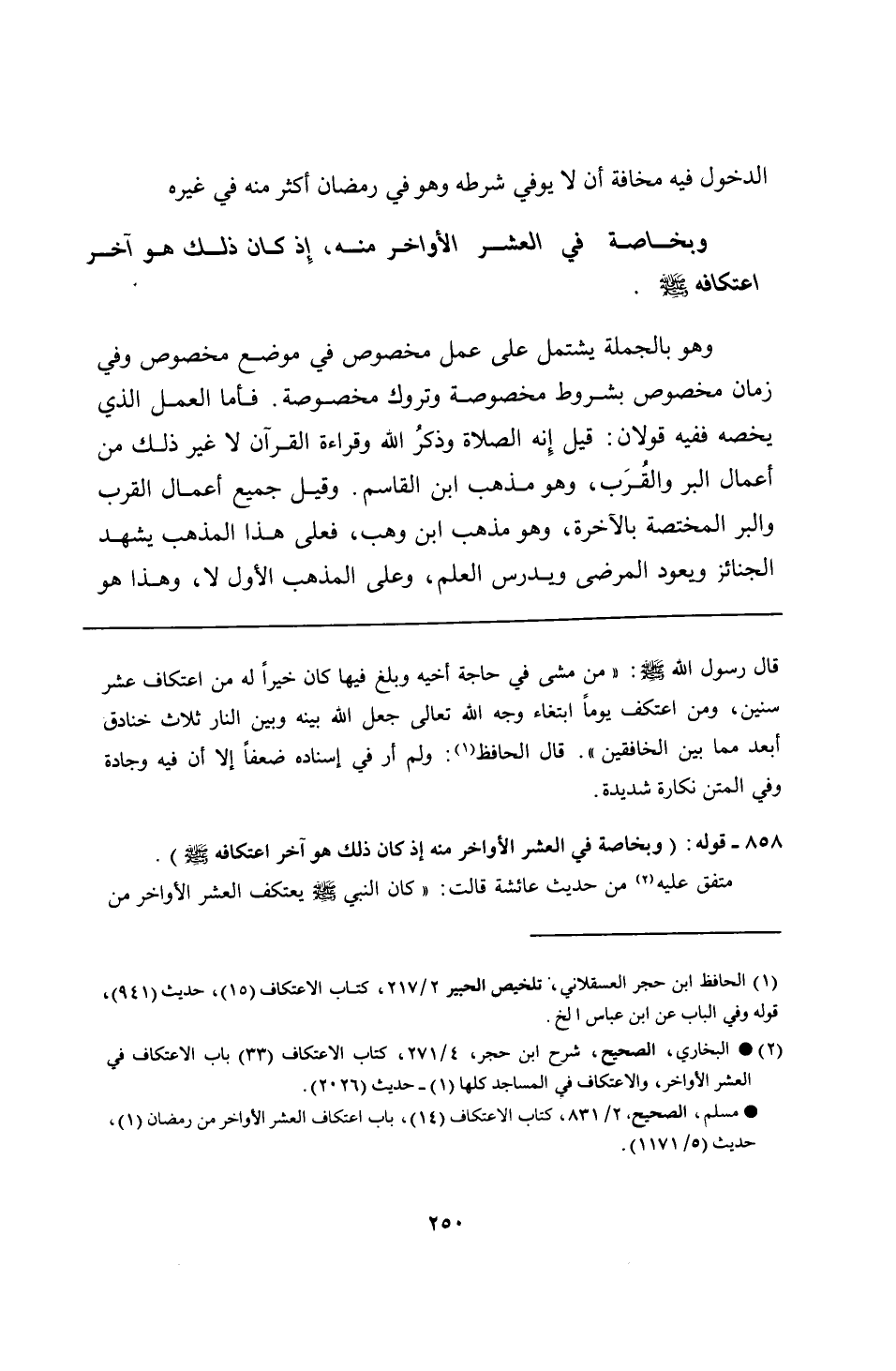 858 - قوله: (وبخاصة في العشر الأواخر منه إذ كان ذلك هو آخر اعتكافه - صلى الله عليه وسلم -).