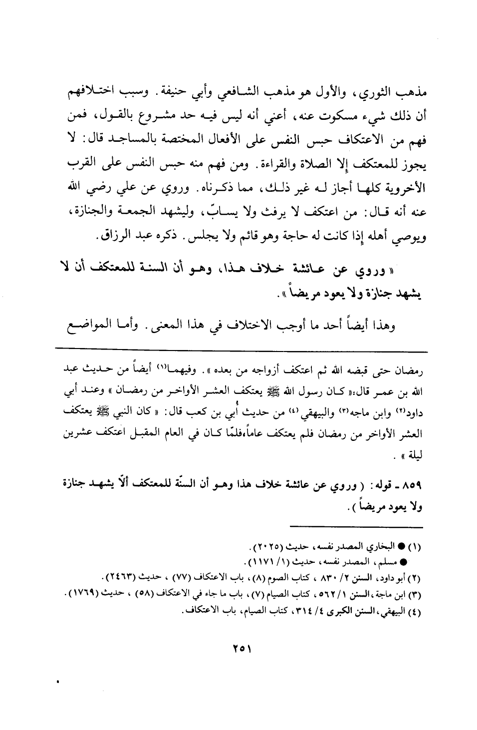 859 - قوله: (وروي عن عائشة خلاف هذا وهو أن السنّة للمعتكف ألّا يشهد جنازة ولا يعود مريضًا).