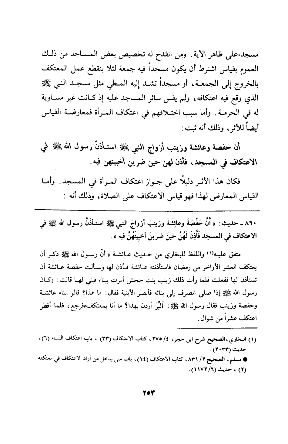 860 - حديث: "أنَّ حَفْصَةَ وعائِشَةَ وزينبَ أزواجَ النبي - صلى الله عليه وسلم - استأذَنَّ رسول الله - صلى الله عليه وسلم - في الاعتكاف في المسجد فَأذِنَ لَهُنَّ حينَ ضربنَ أخبِيتَهُنَّ فيه".