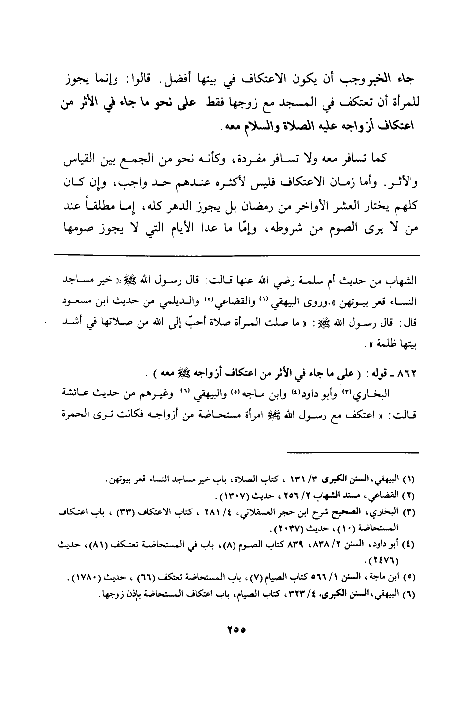 البخاري وأبو داود وابن ماجه والبيهقي وغيرهم من حديث عائشة قالت: "اعتكف مع رسول الله - صلى الله عليه وسلم - امرأة مستحاضة من أزواجه فكانت ترى الحمرة