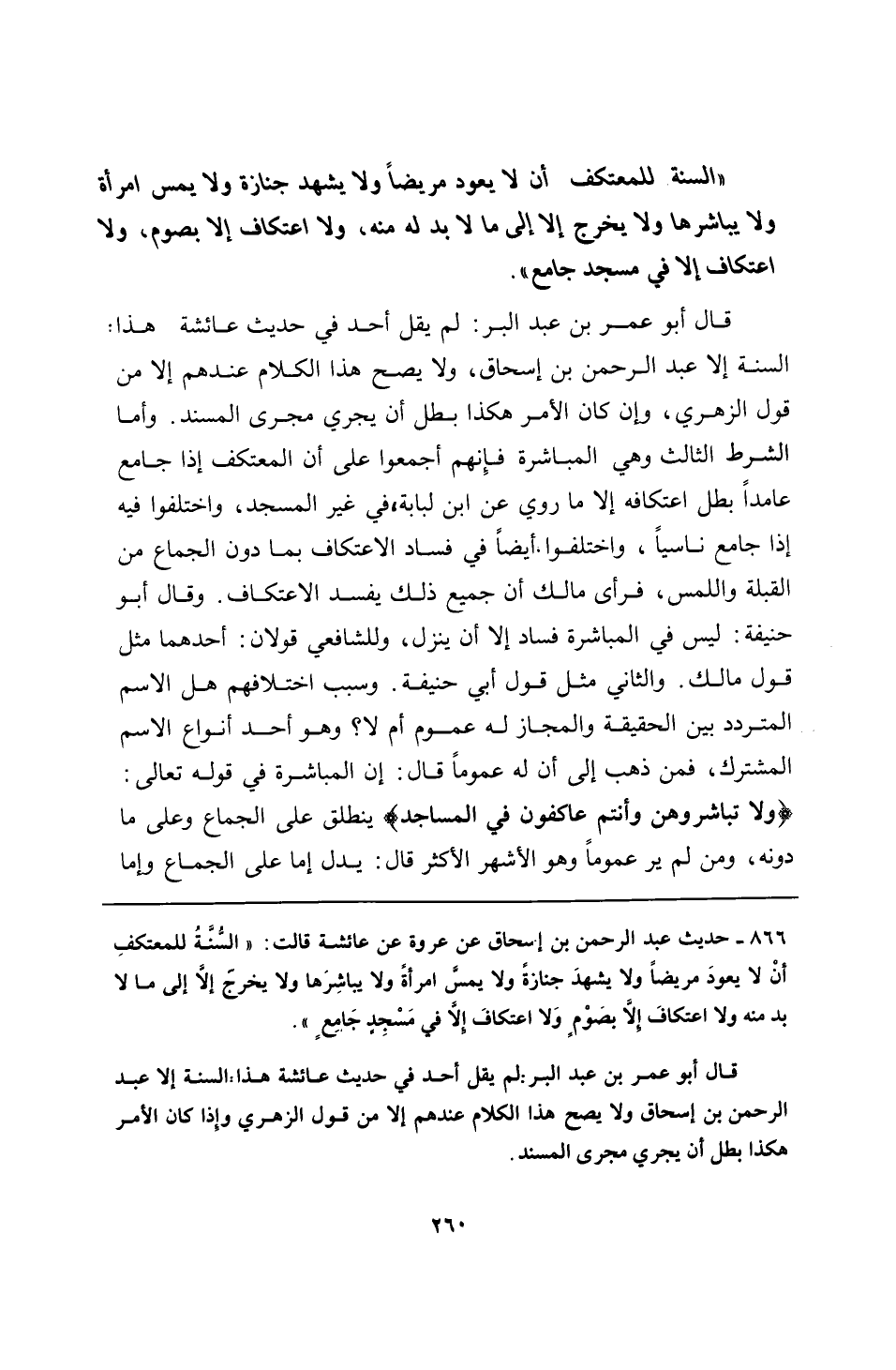 866 - حديث عبد الرحمن بن إسحاق عن عروة عن عائشة قالت: "السُّنَّةُ للمعتكفِ أن لا يعودَ مريضًا ولا يشهدَ جنازةً ولا يمسَّ امرأةً ولا يباشِرَها ولا يخرجَ إلَّا إلى ما لابد منه ولا اعتكافَ إلَّا بصَوْمٍ وَلا اعتكافَ إلَّا في مَسْجِدٍ جَامِعٍ".