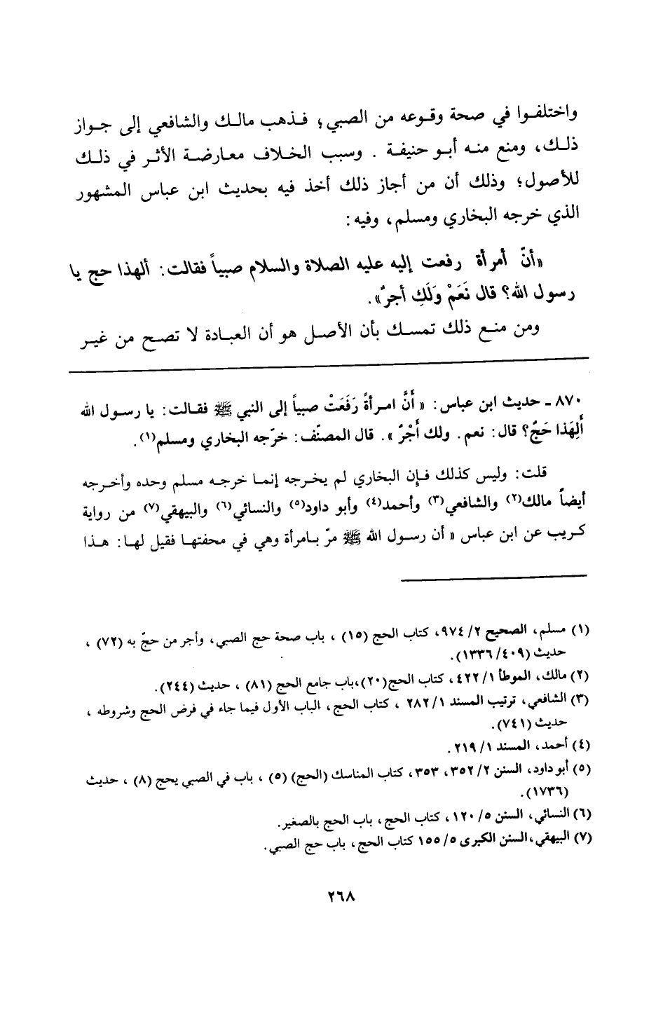 870 - حديث ابن عباس: "أَنَّ امرأةً رَفَعَتْ صبيًا إلى النبي - صلى الله عليه وسلم - فقالت: يا رسول الله ألِهَذا حَجٌ؟ قال: نعم. ولك أجْرٌ". قال المصنّف: خرّجه البخاري ومسلم.