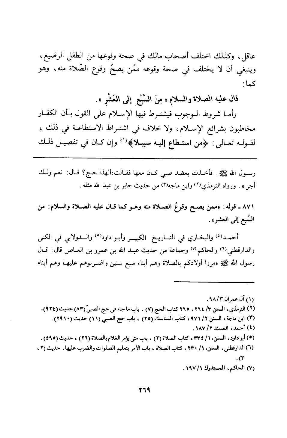 أحمد والبخاري في التاريخ الكبير وأبو داود والدولابي في الكنى والدارقطني والحاكم وجماعة من حديث عبد الله بن عمرو بن العاص قال: قال رسول الله - صلى الله عليه وسلم - "مروا أولادكم بالصلاة وهم أبناء سبع سنين واضربوهم عليها وهم أبناء