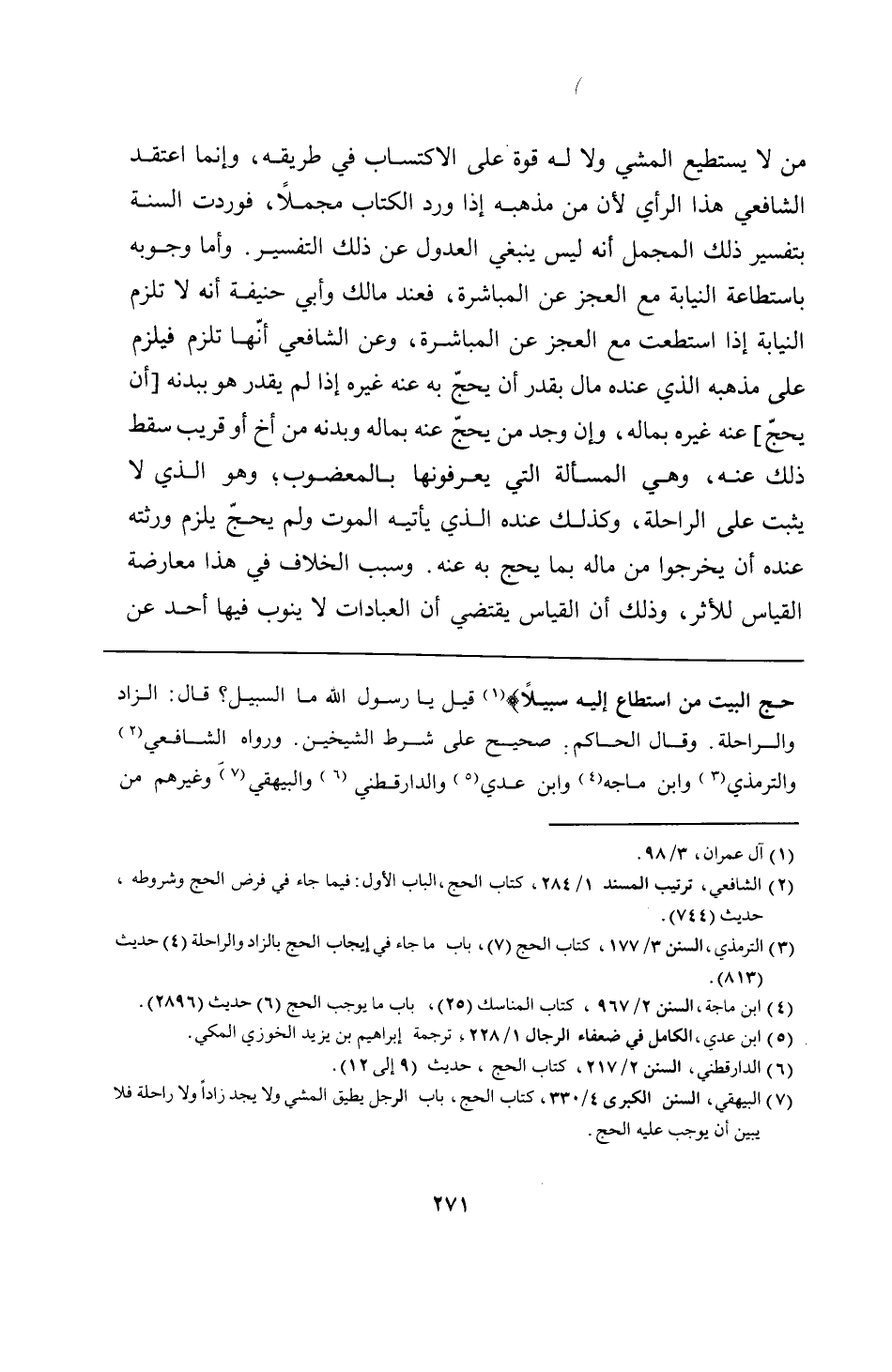 حِجُّ الْبَيْتِ مَنِ اسْتَطَاعَ إِلَيْهِ سَبِيلًا} قيل يا رسول الله ما السبيل؟ قال: الزاد والراحلة. وقال الحاكم: صحيح على شرط الشيخين. ورواه الشافعي والترمذي وابن ماجه وابن عدي والدارقطني والبيهقي وغيرهم من
