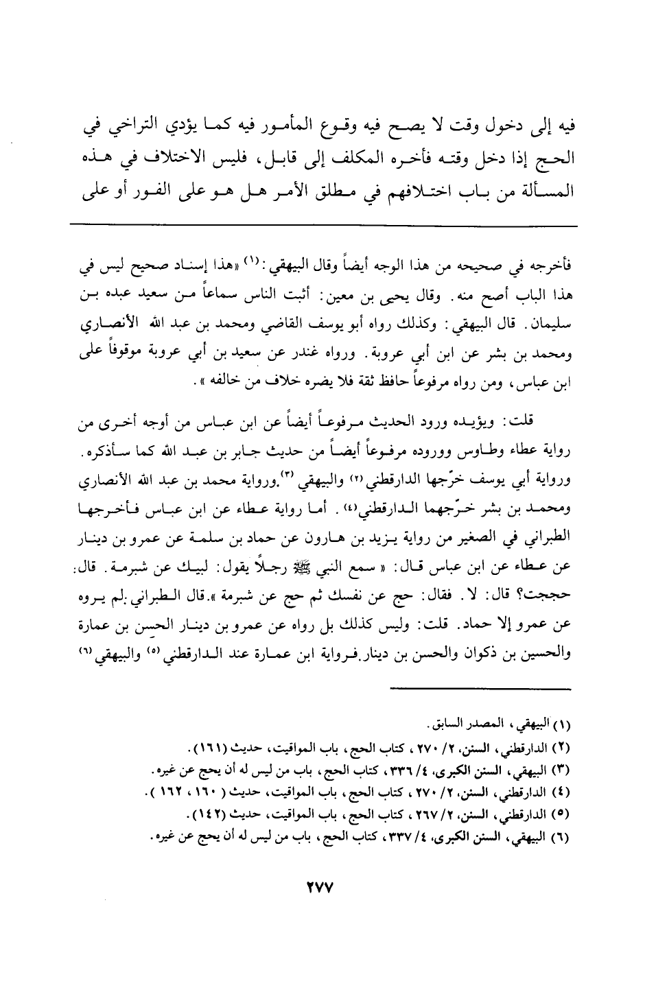 قلت: ويؤيده ورود الحديث مرفوعًا أيضًا عن ابن عباس من أوجه أخرى من رواية عطاء وطاوس ووروده مرفوعًا أيضًا من حديث جابر بن عبد الله كما سأذكره. ورواية أبي يوسف خرّجها الدارقطني والبيهقي. ورواية محمد بن عبد الله الأنصارىِ ومحمد بن بشر خرّجهما الدارقطني. أما رواية عطاء عن ابن عباس فأخرجها الطبراني في الصغير من رواية يزيد بن هارون عن حماد بن سلمة عن عمرو بن دينار عن عطاء عن ابن عباس قال: "سمع النبي - صلى الله عليه وسلم - رجلًا يقول: لبيك عن شبرمة. قال: حججت؟ قال: لا. فقال: حج عن نفسك ثم حج عن شبرمة". قال الطبراني: لم يروه عن عمرو إلا حماد. قلت: وليس كذلك بل رواه عن عمرو بن دينار الحسن بن عمارة والحسين بن ذكوان والحسن بن دينار فرواية ابن عمارة عند الدارقطني والبيهقي