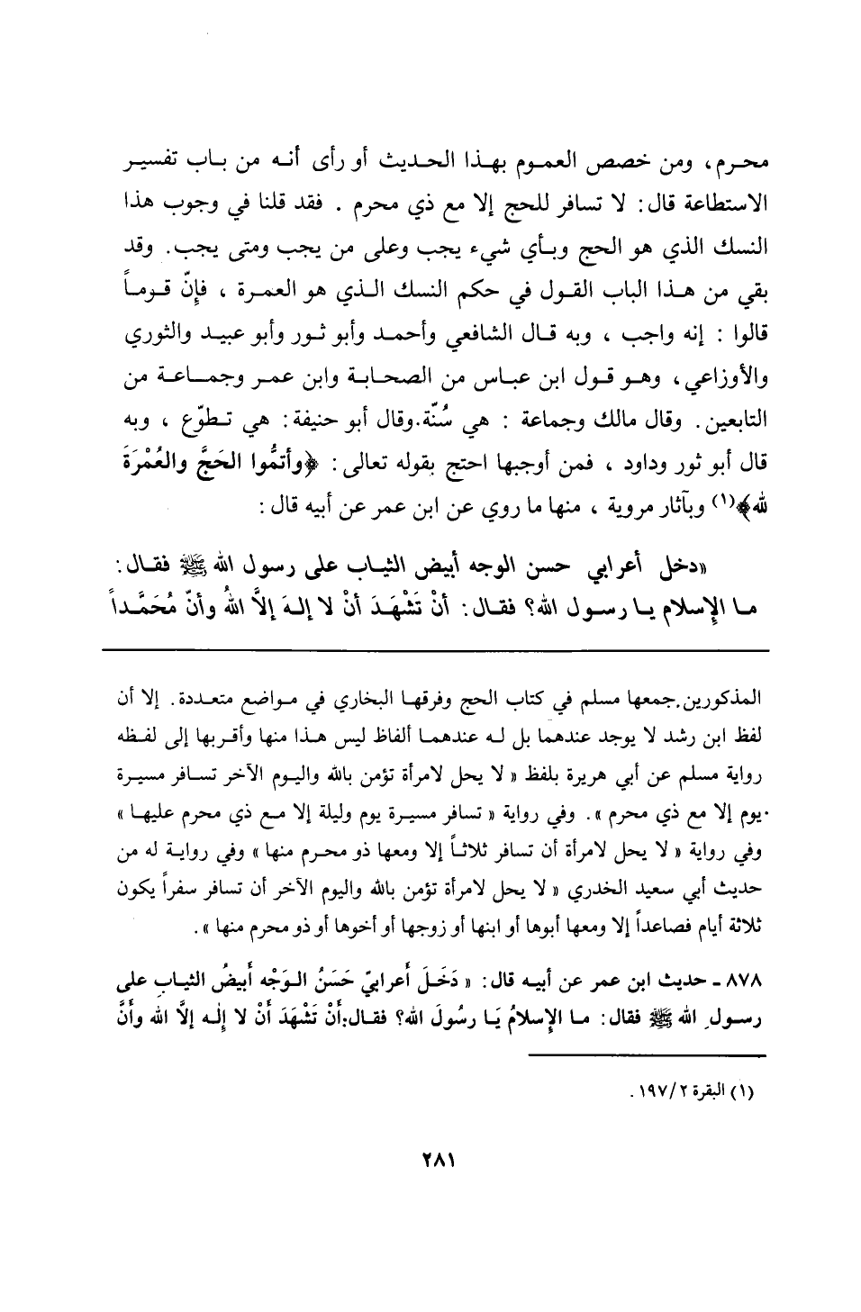المذكورين. جمعها مسلم في كتاب الحج وفرقها البخاري في مواضع متعددة. إلا أن لفظ ابن رشد لا يوجد عندهما بل له عندهما ألفاظ ليس هذا منها وأقربها إلى لفظه رواية مسلم عن أبي هريرة بلفظ "لا يحل لامرأة تؤمن بالله واليوم الآخر تسافر مسيرة يوم إلا مع ذي محرم". وفي رواية "تسافر مسيرة يوم وليلة إلا مع ذي محرم عليها" وفي رواية "لا يحل لامرأة أن تسافر ثلاثًا إلا ومعها ذو محرم منها" وفي رواية له من حديث أبي سعيد الخدري "لا يحل لامرأة تؤمن بالله واليوم الآخر أن تسافر سفرًا يكون ثلاثة أيام فصاعدًا إلا ومعها أبوها أو ابنها أو زوجها أو أخوها أو ذو محرم منها".