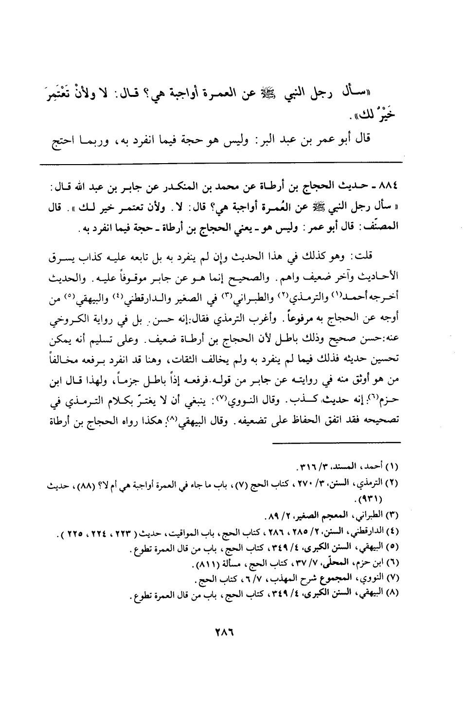 884 - حديث الحجاج بن أرطاة عن محمد بن المنكدر عن جابر بن عبد الله قال: "سأل رجل النبي - صلى الله عليه وسلم - عن العُمرة أواجبة هي؟ قال: لا. ولأن تعتمر خير لك". قال المصنّف: قال أبو عمر: وليس هو -يعني الحجاج بن أرطاة- حجة فيما انفرد به.