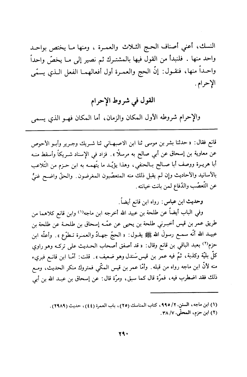قانع فقال: "حدثنا بشر بن موسى ثنا ابن الأصبهاني ثنا شريك وجرير وأبو الأحوص عن معاوية بن إسحاق عن أبي صالح به مرسلًا". فزاد في الإِسناد شريكًا وأسقط منه أبا هريرة ووصف أبا صالح بالحنفي، وهذا يؤيّد ما يتّهمه به ابن حزم من التّلاعب بالأسانيد والأحاديث وإِن لم يقبل ذلك منه المتعصّبون المغرضون. والحقّ واضح غنيٌّ عن التّعصّب والدّفاع لمن بانت خيانته.
