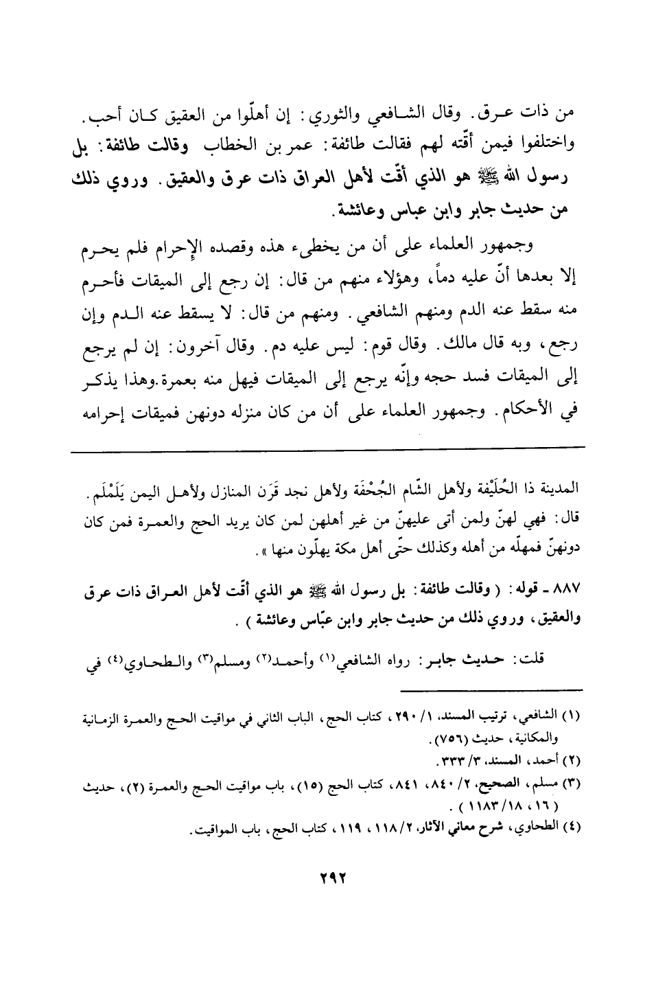 887 - قوله: (وقالت طائفة: بل رسول الله - صلى الله عليه وسلم - هو الذي أقّت لأهل العراق ذات عرق والعقيق، وروي ذلك من حديث جابر وابن عبّاس وعائشة).