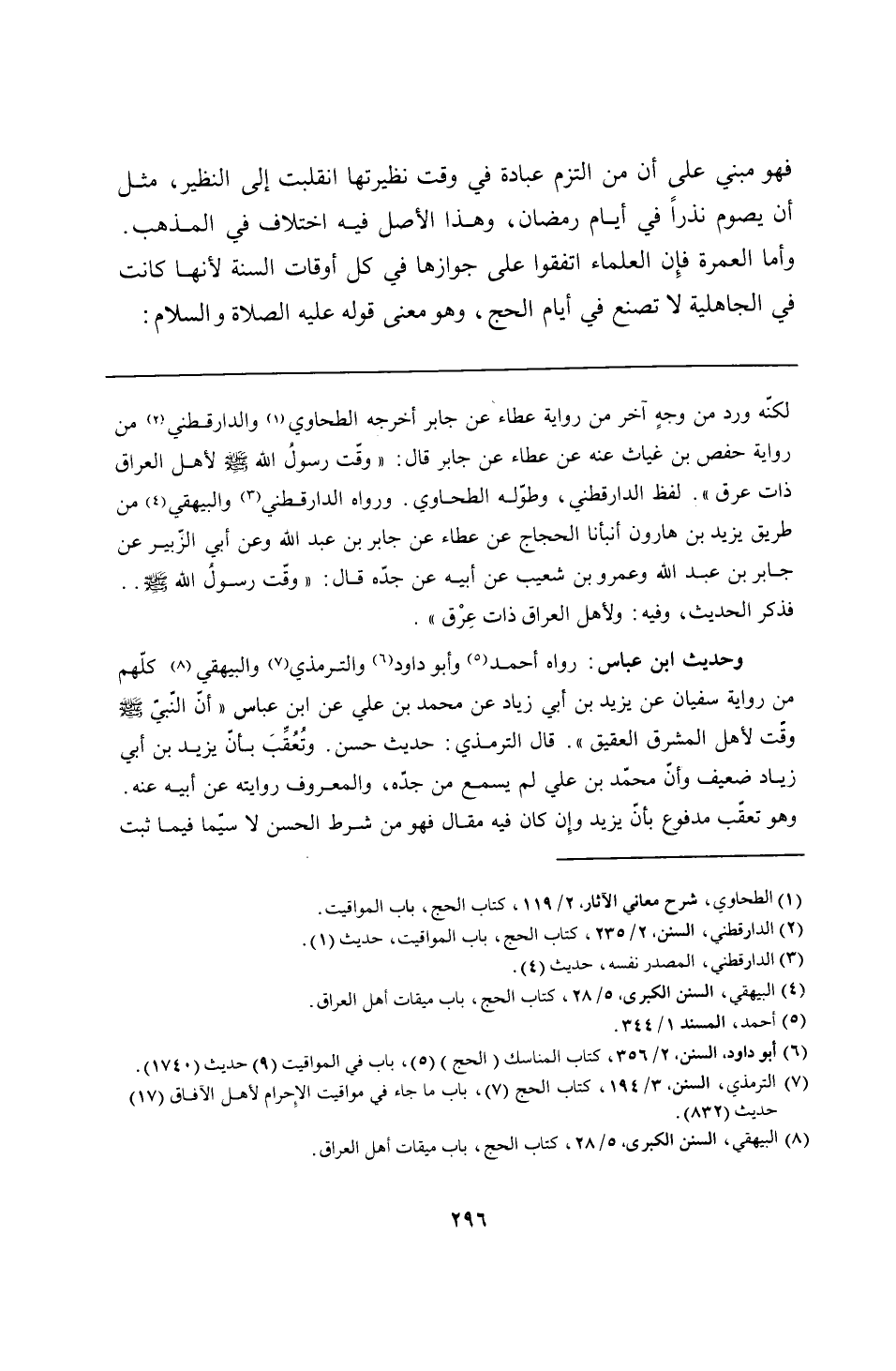 وحديث ابن عباس: رواه أحمد وأبو داود والترمذي والبيهقي كلّهم من رواية سفيان عن يزيد بن أبي زياد عن محمد بن علي عن ابن عباس "أنّ النّبىّ - صلى الله عليه وسلم - وقّت لأهل المشرق العقيق". قال الترمذي: حديث حسن. وتُعُقِّبَ بأنّ يزيد بن أبي زياد ضعيف وأنّ محمد بن علي لم يسمع من جدّه، والمعروف روايته عن أبيه عنه. وهو تعقّب مدفوع بأنّ يزيد وإِن كان فيه مقال فهو من شرط الحسن لاسيّما فيما ثبت