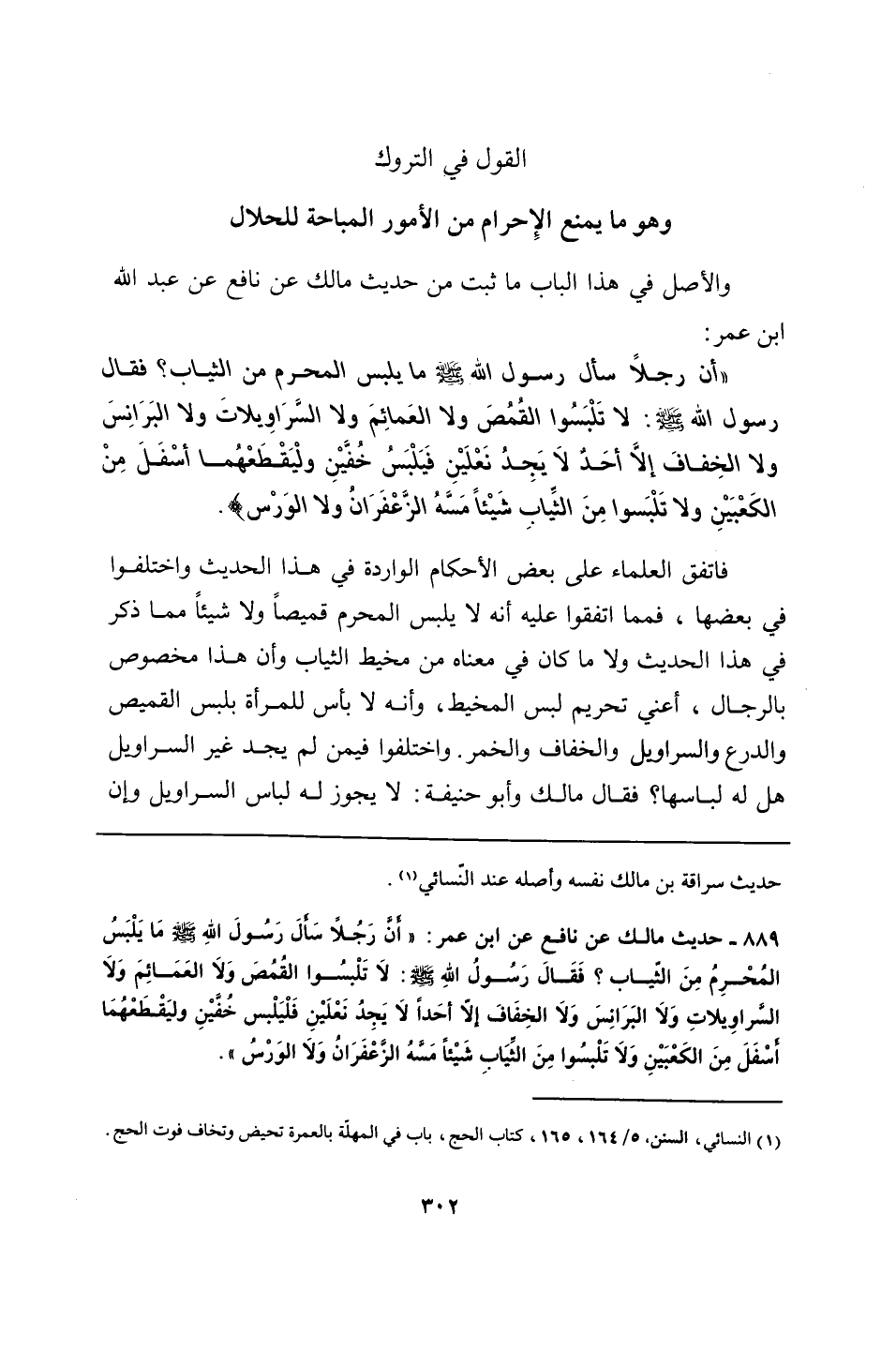 889 - حديث مالك عن نافع عن ابن عمر: "أَنَّ رَجُلًا سَألَ رَسُولَ اللهِ - صلى الله عليه وسلم - مَا يَلْبَسُ المُحْرِمُ مِنَ الثّياب؟ فَقَالَ رَسُولُ اللهِ - صلى الله عليه وسلم -: لَا تَلْبسُوا القُمُصَ وَلَا العَمَائِمَ وَلَا السَّراوِيلاتِ وَلَا البَرَانِسَ وَلَا الخِفَافَ إلّا أحَدًا لَا يَجِدُ نَعْلَيْنِ فَلْيَلْبس خُفَّيْنِ وليَقْطَعْهُمَا أسْفَلَ مِنَ الكَعْبَيْنِ وَلَا تَلْبسُوا مِنَ الثيَابِ شَيْئًا مَسَّهُ الزَّعْفَرَانُ وَلَا الوَرْسُ".