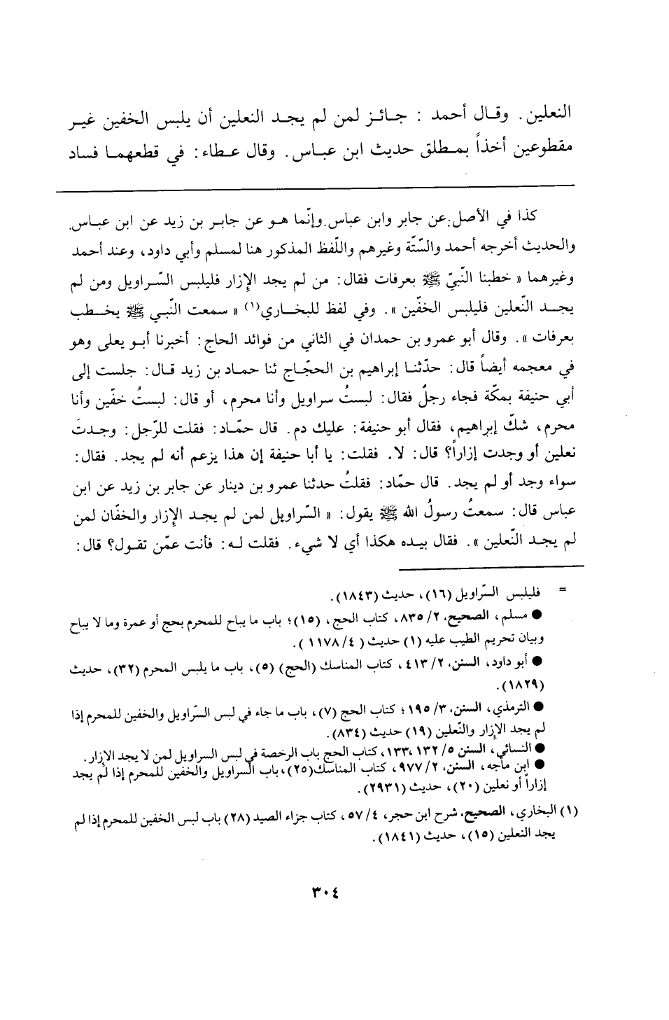 كذا في الأصل: عن جابر وابن عباس وإنّما هو عن جابر بن زيد عن ابن عباس والحديث أخرجه أحمد والسّتّة وغيرهم واللّفظ المذكور هنا لمسلم وأبي داود، وعند أحمد وغيرهما "خطبنا النّبيّ - صلى الله عليه وسلم - بعرفات فقال: من لم يجد الإِزار فليلبس السّراويل ومن لم يجد النّعلين فليلبس الخفّين". وفي لفظ للبخاري "سمعت النّبي - صلى الله عليه وسلم - يخطب بعرفات". وقال أبو عمرو بن حمدان في الثاني من فوائد الحاج: أخبرنا أبو يعلى وهو في معجمه أيضًا قال: حدّثنا إبراهيم بن الحجّاج ثنا حماد بن زيد قال: جلست إلى أبىِ حنيفة بمكّة فجاء رجلٌ فقال: لبستُ سراويل وأنا محرم، أو قال: لبستُ خفّين وأنا محرم، شكّ إبراهيم، فقال أبو حنيفة: عليك دم. قال حمّاد: فقلت للرّجل: وجدتَ نعلين أو وجدت إزارًا؟ قال: لا. فقلت: يا أبا حنيفة إن هذا يزعم أنه لم يجد. فقال: سواء وجد أو لم يجد. قال حمّاد: فقلتُ حدثنا عمرو بن دينار عن جابر بن زيد عن ابن عباس قال: سمعتُ رسولُ الله - صلى الله عليه وسلم - يقول: "السّراويل لمن لم يجد الإِزار والخفّان لمن لم يجد النّعلين". فقال بيده هكذا أي لا شيء. فقلت له: فأنت عمّن تقول؟ قال: