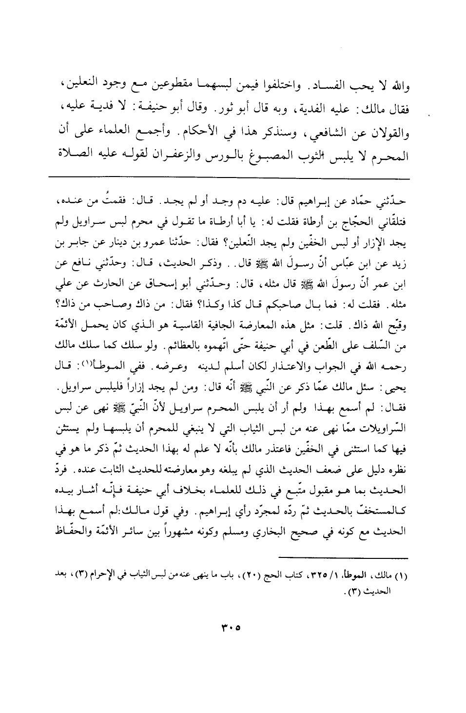 حدّثني حمّاد عن إبراهيم قال: عليه دم وجد أو لم يجد. قال: فقمتُ من عنده، فتلقّاني الحجّاج بن أرطاة فقلت له: يا أبا أرطاة ما تقول في محرم لبس سراويل ولم يجد الإِزار أو لبس الخفّين ولم يجد النّعلين؟ فقال: حدّثنا عمرو بن دينار عن جابر بن زيد عن ابن عبّاس أنّ رسولَ الله - صلى الله عليه وسلم - قال .. وذكر الحديث، قال: وحدّثني نافع عن ابن عمر أنّ رسولَ الله - صلى الله عليه وسلم - قال مثله، قال: وحدّثني أبو إسحاق عن الحارث عن علي مثله. فقلت له: فما بال صاحبكم قال كذا وكذا؟ فقال: من ذاك وصاحب من ذاك؟ وقبّح الله ذاك. قلت: مثل هذه المعارضة الجافية القاسية هو الذي كان يحمل الأئمّة من السّلف على الطّعن في أبي حنيفة حتّى اتّهموه بالعظائم. ولو سلك كما سلك مالك رحمه الله في الجواب والاعتذار لكان أسلم لدينه وعرضه. ففي الموطأ: قال يحيى: سئل مالك عمّا ذكر عن النّبي - صلى الله عليه وسلم - أنّه قال: ومن لم يجد إزارًا فليلبس سراويل. فقال: لم أسمع بهذا ولم أر أن يلبس المحرم سراويل لأن النّبيّ - صلى الله عليه وسلم - نهى عن لبس السّراويلات ممّا نهى عنه من لبس الثياب التي لا ينبغي للمحرم أن يلبسها ولم يستثن فيها كما استثنى في الخفين فاعتذر مالك بأنّه لا علم له بهذا الحديث ثمّ ذكر ما هو في نظره دليل على ضعف الحديث الذي لم يبلغه وهو معارضته للحديث الثابت عنده. فردّ الحديث بما هو مقبول متّبع في ذلك للعلماء بخلاف أبي حنيفة فإِنّه أشار بيده كالمستخفّ بالحديث ثمّ ردّه لمجرد رأي إبراهيم. وفي قول مالك: لم أسمع بهذا الحديث مع كونه في صحيح البخاري ومسلم وكونه مشهورًا بين سائر الأئمّة والحفّاظ