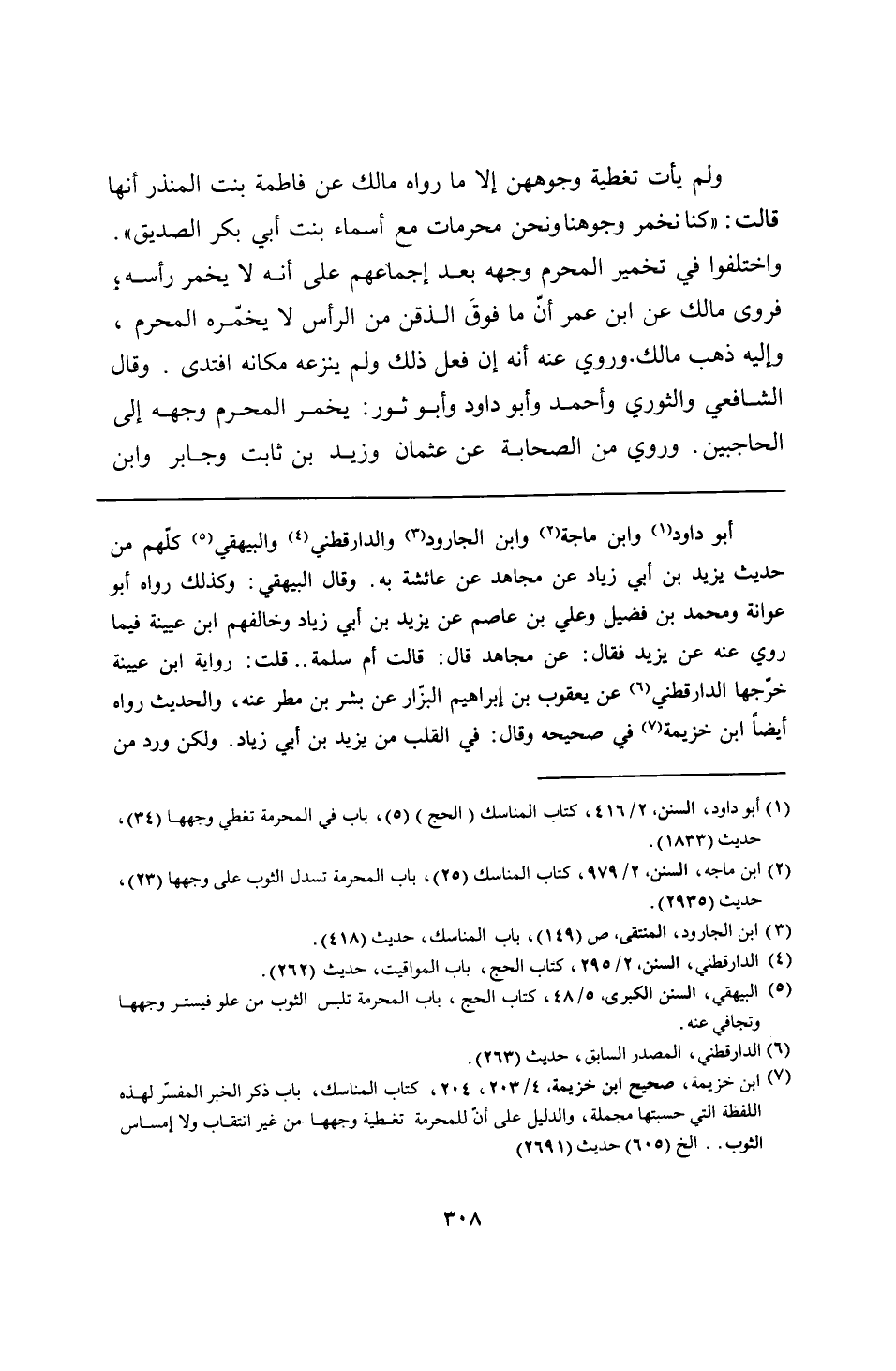 أبو داود وابن ماجة وابن الجارود والدارقطني والبيهقي كلّهم من حديث يزيد بن أبي زياد عن مجاهد عن عائشة به. وقال البيهقي: وكذلك رواه أبو عوانة ومحمد بن فضيل وعلي بن عاصم عن يزيد بن أبي زياد وخالفهم ابن عيينة فيما روي عنه عن يزيد فقال: عن مجاهد قال: قالت أم سلمة .. قلت: رواية ابن عيينة خرّجها الدارقطني عن يعقوب بن إبراهيم البزّار عن بشر بن مطر عنه، والحديث رواه أيضًا ابن خزيمة في صحيحه وقال: في القلب من يزيد بن أبي زياد. ولكن ورد من