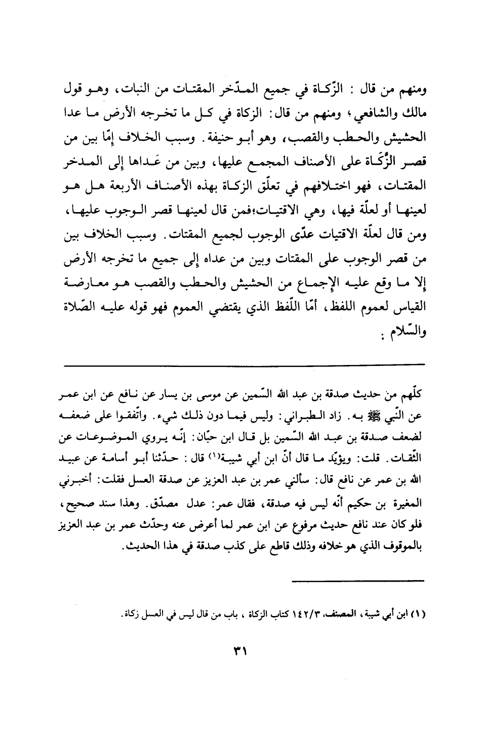 كلّهم من حديث صدقة بن عبد الله السّمين عن موسى بن يسار عن نافع عن ابن عمر عن النّبي - صلى الله عليه وسلم - به. زاد الطبراني: وليس فيما دون ذلك شيء. واتّفقوا على ضعفه لضعف صدقة بن عبد الله السّمين بل قال ابن حبّان: إنّه يروي الموضوعات عن الثّقات. قلت: ويؤيّد ما قال أنّ ابن أبي شيبة قال: حدّثنا أبو أسامة عن عبيد الله بن عمر عن نافع قال: سألني عمر بن عبد العزيز عن صدقة العسل فقلت: أخبرني المغيرة بن حكيم أنّه ليس فيه صدقة، فقال عمر: عدل مصدّق. وهذا سند صحيح، فلو كان عند نافع حديث مرفوع عن ابن عمر لما أعرض عنه وحدّث عمر بن عبد العزيز بالموقوف الذي هو خلافه وذلك قاطع على كذب صدقة في هذا الحديث.