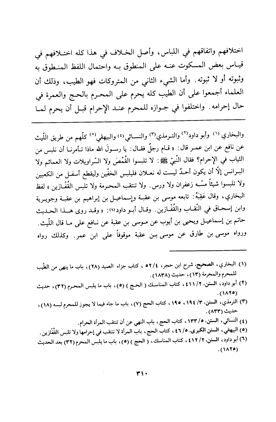 والبخاري وأبو داود والترمذي والنسائي والبيهقي كلّهم من طريق اللّيث عن نافع عن ابن عمر قال: "قام رجل فقال: يا رسولَ الله ماذا تأمرنا أن نلبس من الثياب في الإِحرام؟ فقال النّبيّ - صلى الله عليه وسلم -: لا تلبسوا القُمُصَ ولا السّراويلات ولا العمائم ولا البرانس إلَّا أن يكون أحدٌ ليست له نعلان فليلبس الخفّين وليقطع أسفل من الكعبين ولا تلبسوا شيئًا مسه زعفران ولا ورس. ولا تنتقب المحرمة ولا تلبس القُفّازين" لفظ البخاري، وقال عَقِبَهُ: تابعه موسى بن عقبة وإِسماعيل بن إبراهيم بن عقبة وجويرية وابن إسحاق في النّقاب والقُفّازين. وقال أبو داود: "وقد روى هذا الحديث حاتم بن إسماعيل ويحيى بن أيوب عن موسى بن عقبة عن نافع على ما قال اللّيث. ورواه موسى بن طارق عن موسى بن عقبة موقوفًا على ابن عمر. وكذلك رواه