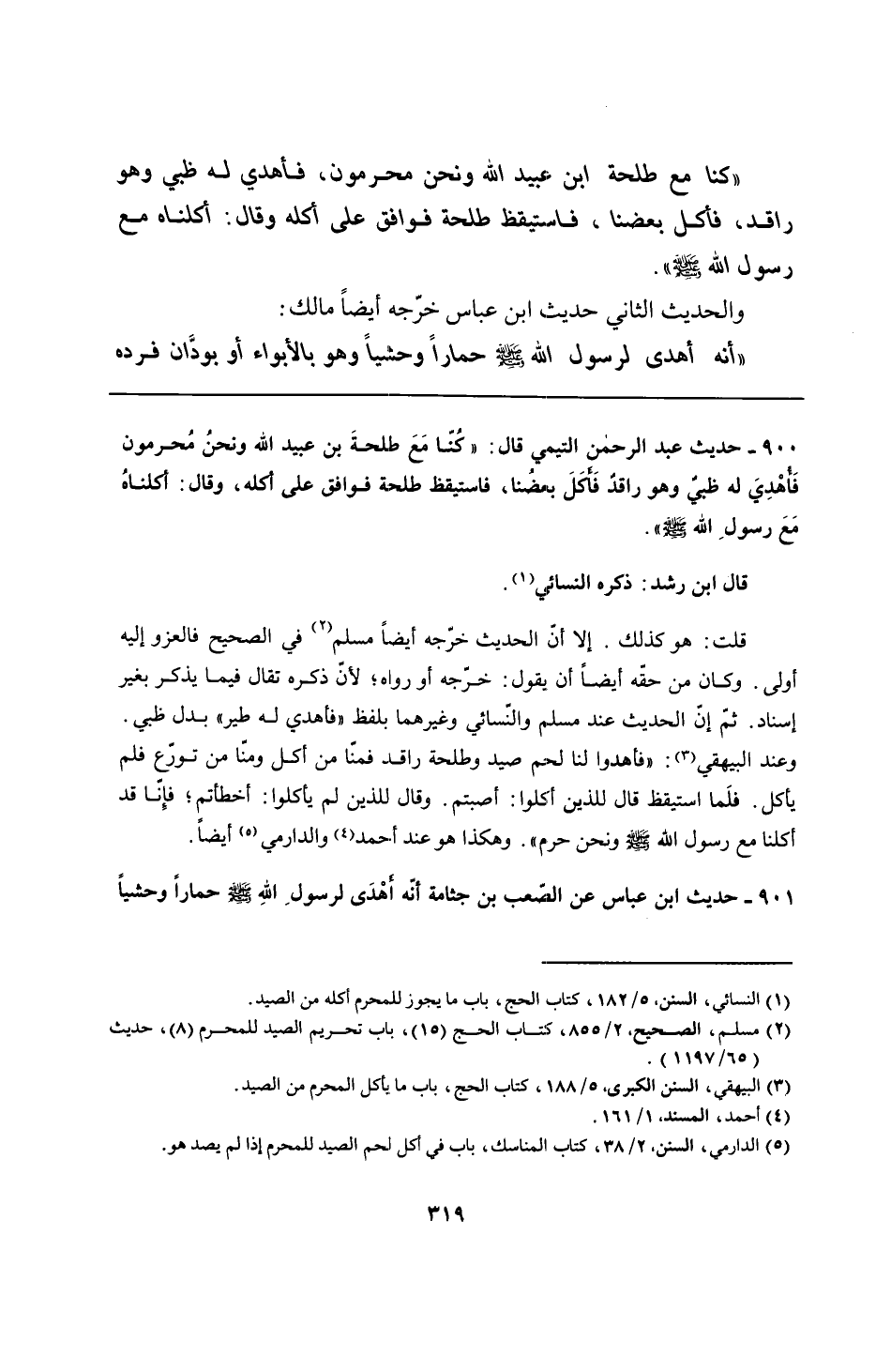 900 - حديث عبد الرحمن التيمي قال: "كُنّا مَعَ طلحةَ بن عبيد الله ونحنُ مُحرمون فَأُهْدِيَ له ظبىٌ وهو راقدٌ فَأَكَلَ بعضُنا، فاستيقظ طلحة فوافق على أكله، وقال: أكلناهُ مَعَ رسولِ الله - صلى الله عليه وسلم -".