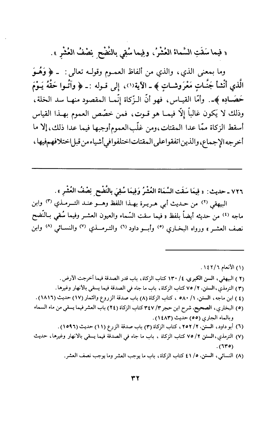 726 - حديث: "فِيمَا سَقَت السَّمَاءُ العُشْرُ وَفِيمَا سُقِيَ بالنَّضْحِ نِصْفُ العُشْرِ".
